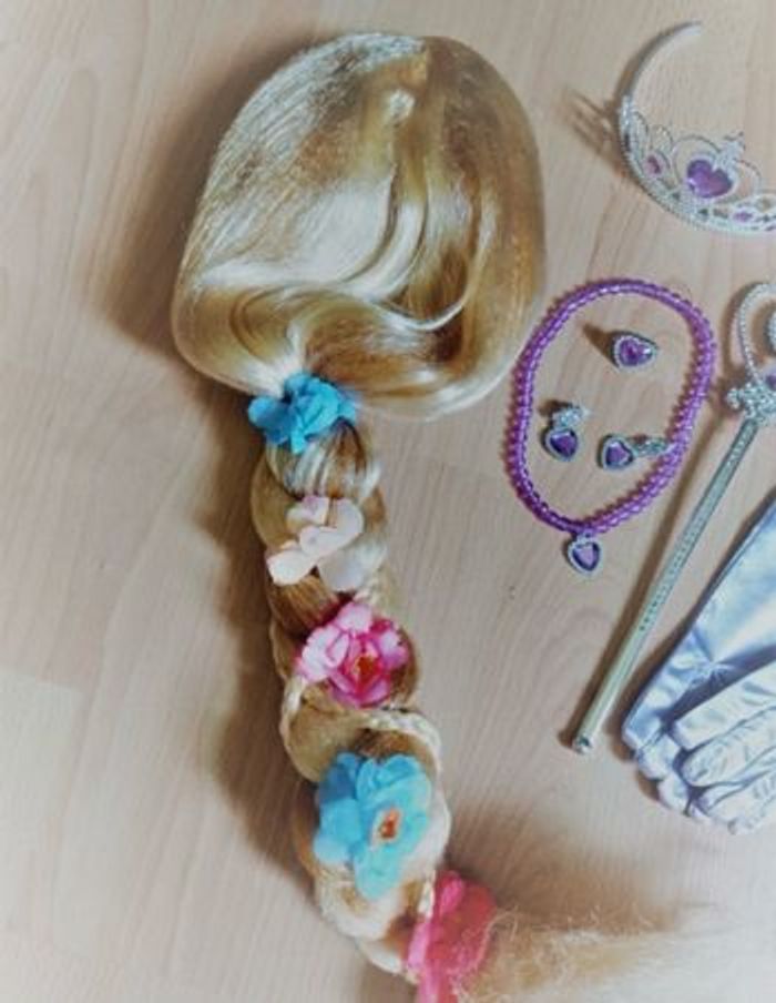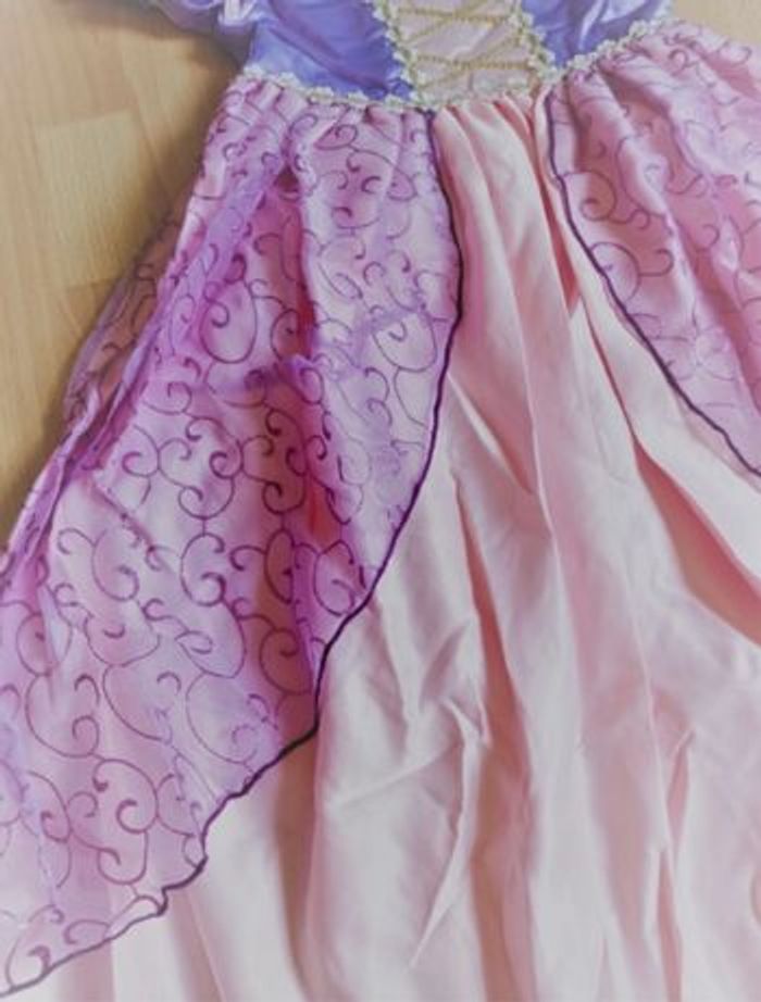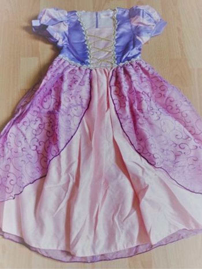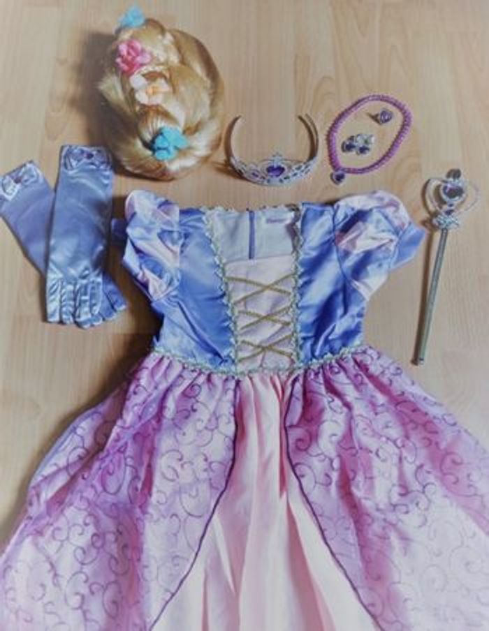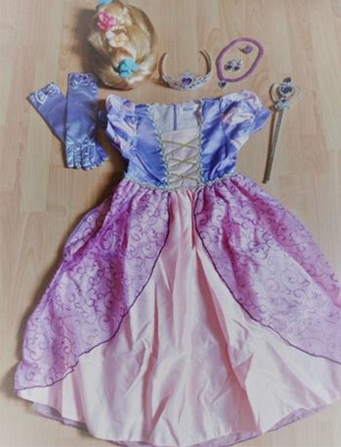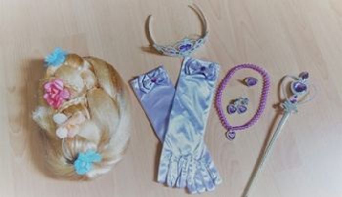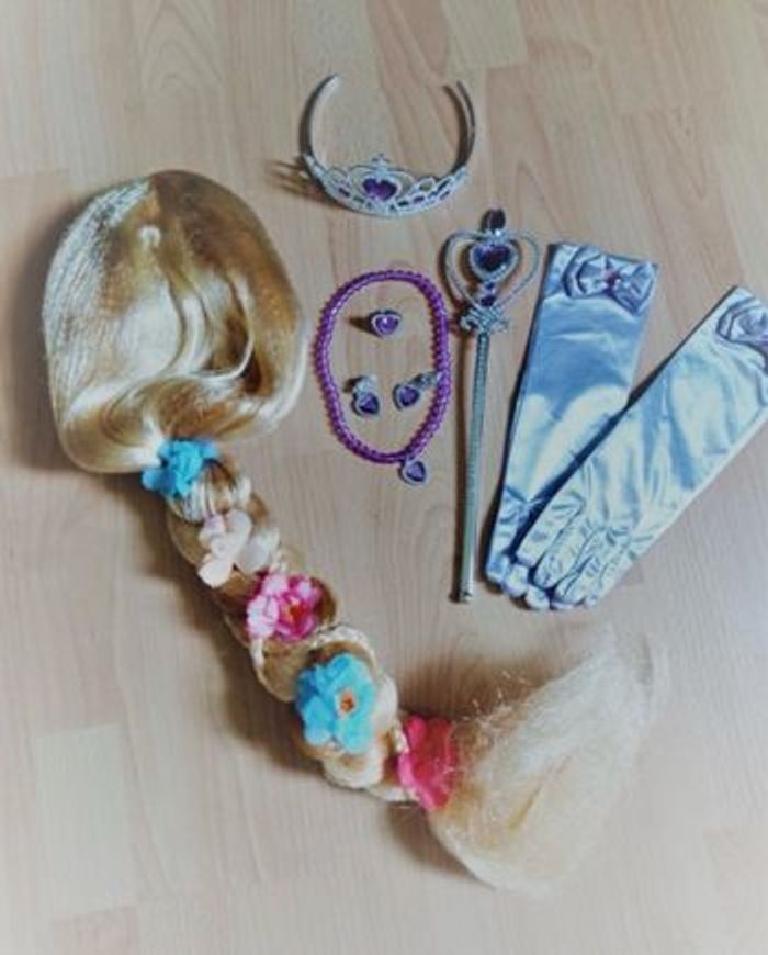 Déguisement robe princesse raiponce perruque et ces accessoires (couronne, baguette, gants, bijoux, perruque). La robe mesure 80cm, la taille convient aux petites filles de 5ans. Totalement neuve, vendue dans son emballage d’origine. Expédition rapide après votre commande