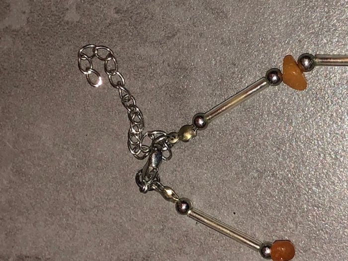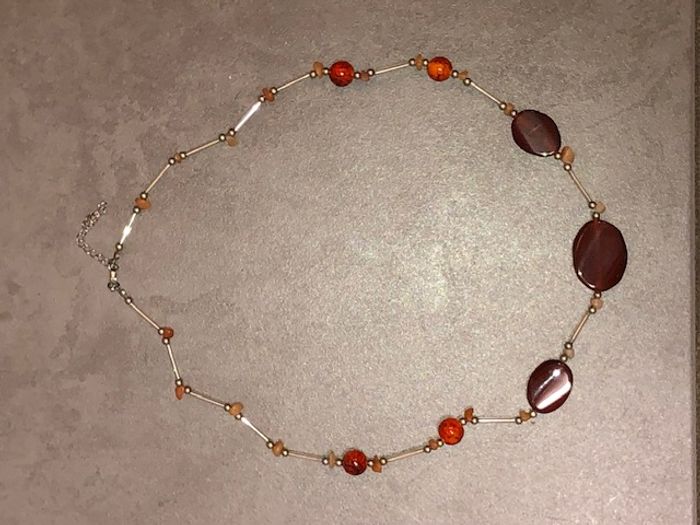Collier avec des pierres dans les tons marron et orangé. Longueur totale entre 70 et 76 cm selon le réglage Très bon état