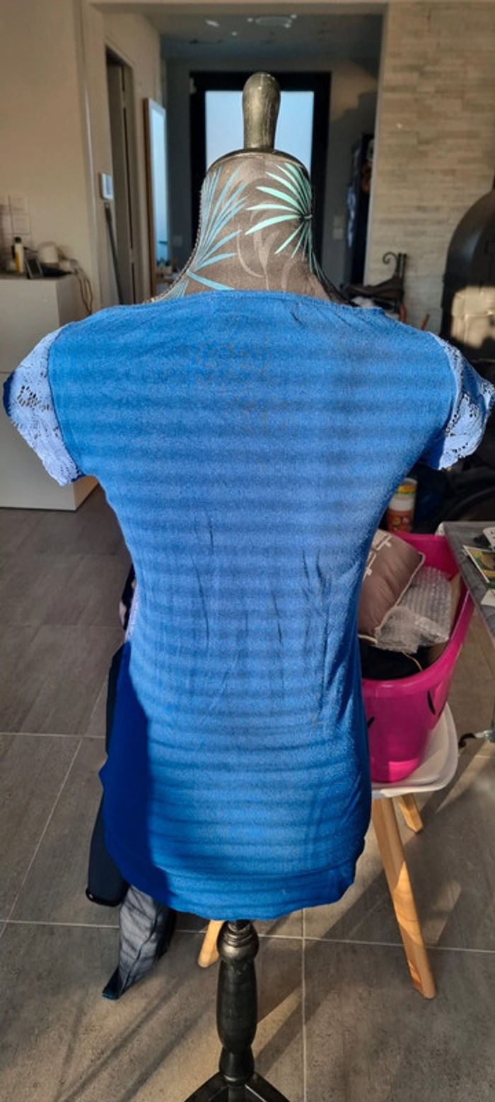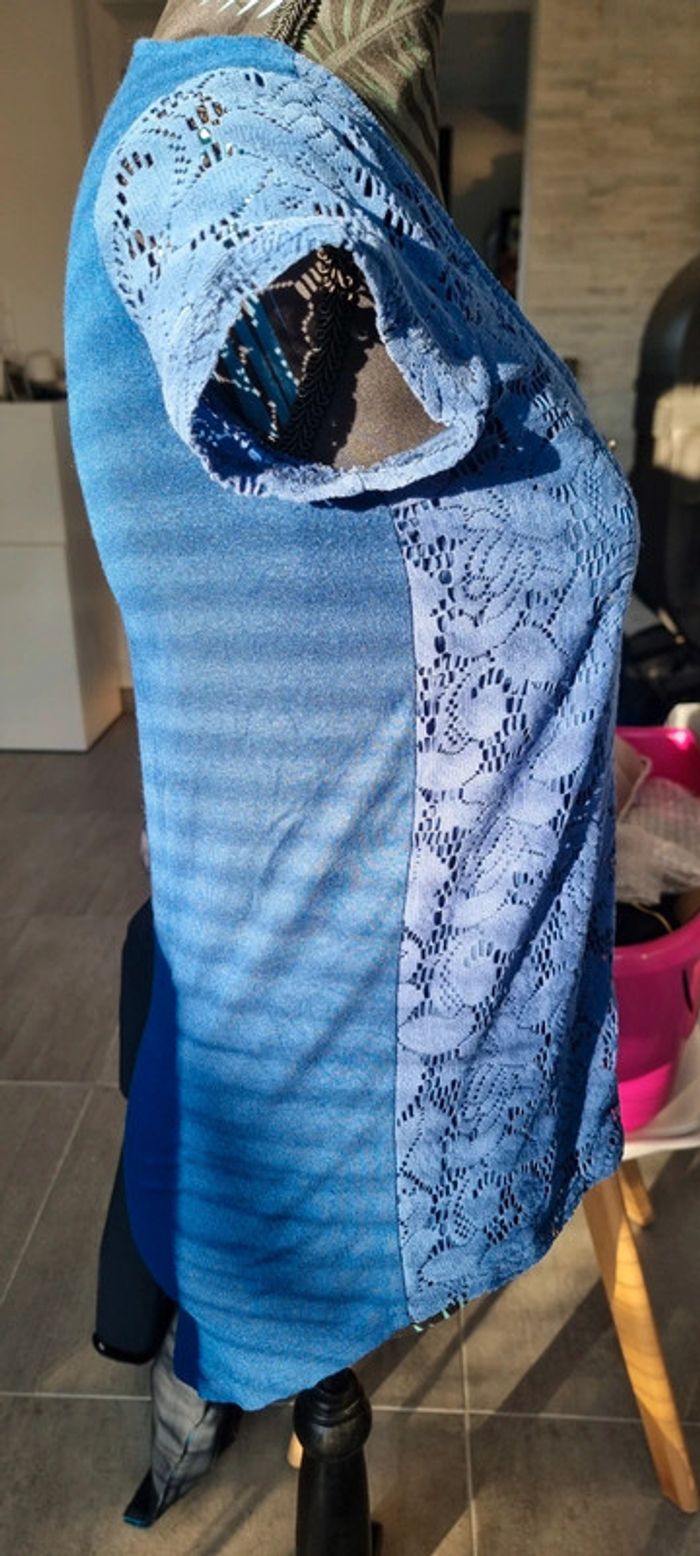 Joli tee-shirt bi matière pour femme. Dentelle devant avec fausse petite poche poitrine dorée. Légèrement plus long dans le dos que devant. Taille 1 Excellent état. A retirer sur Vannes et alentours ou envoi rapide et soigné. Prix 3 € D'autres accessoires, jouets et vêtements disponibles et autres tailles, dans le dressing. N'hésitez pas à me demander ☺️ #angita56_femme #angita56_trentesixfemme