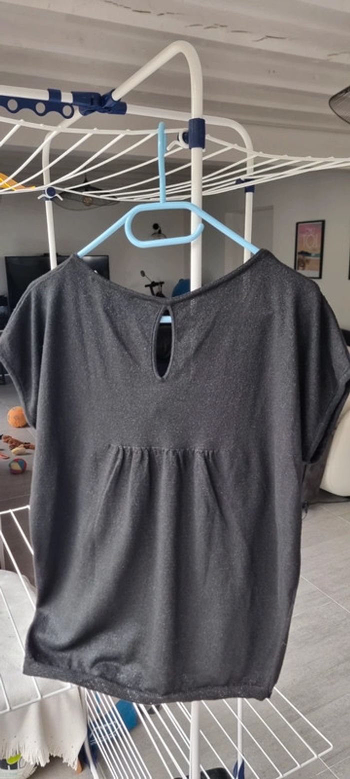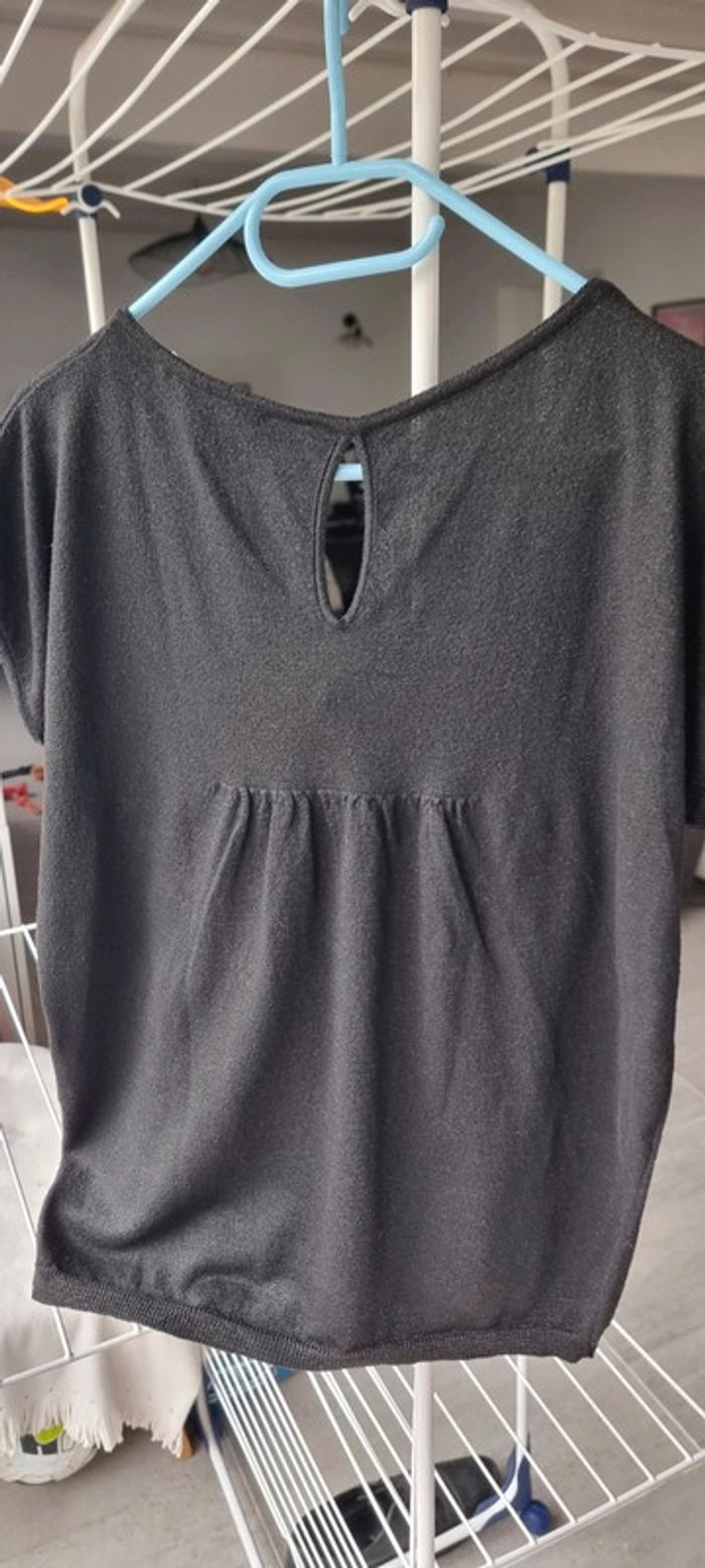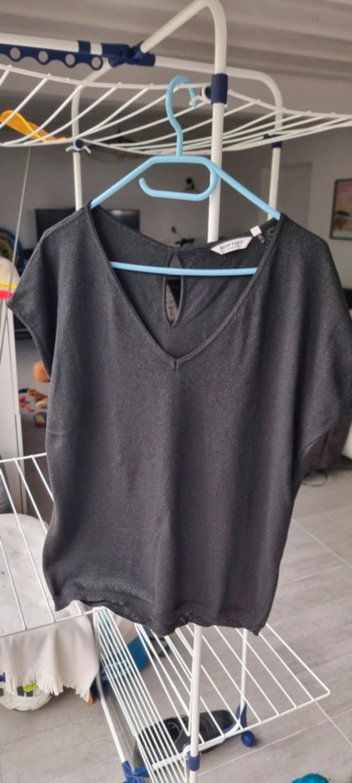 Ravissant tee-shirt noir à col V avec fils métallisés et sans manches. D'autres accessoires, jouets et vêtements disponibles et autres tailles, dans le dressing. N'hésitez pas à me demander ☺️ A retirer sur Vannes et alentours ou envoi rapide et soigné. Tee-shirt en excellent état, taille XL Naf Naf. Prix 7 € #angita56_ete #angita56_quarantedeuxfemme