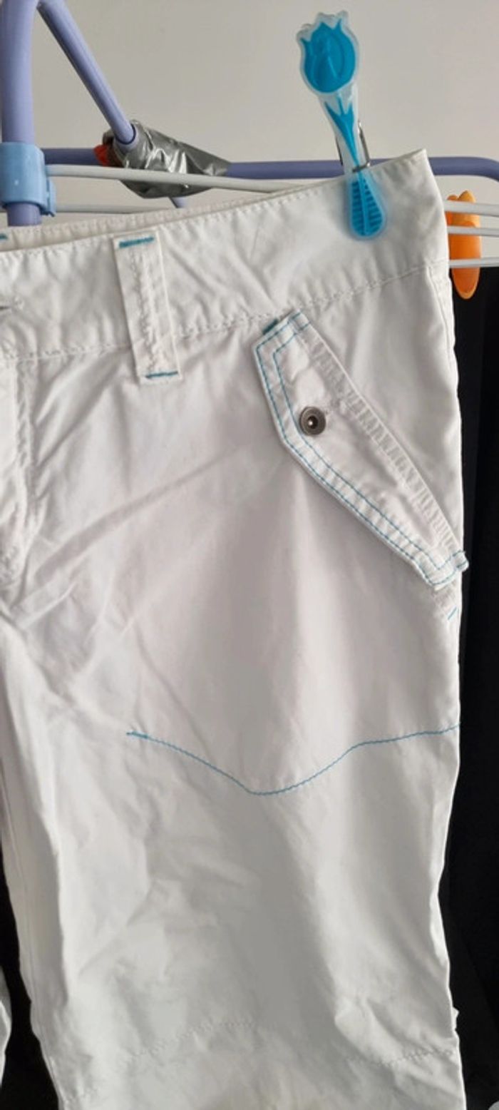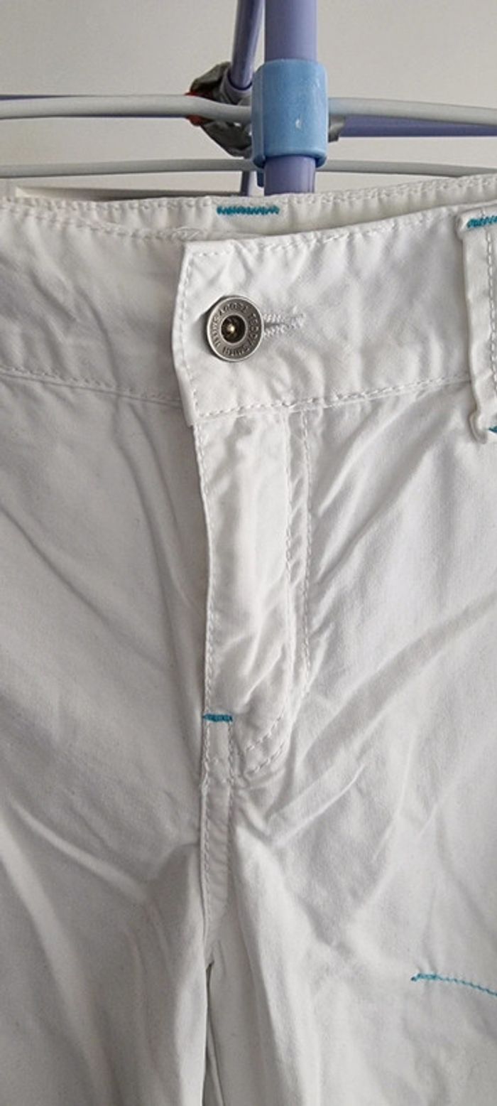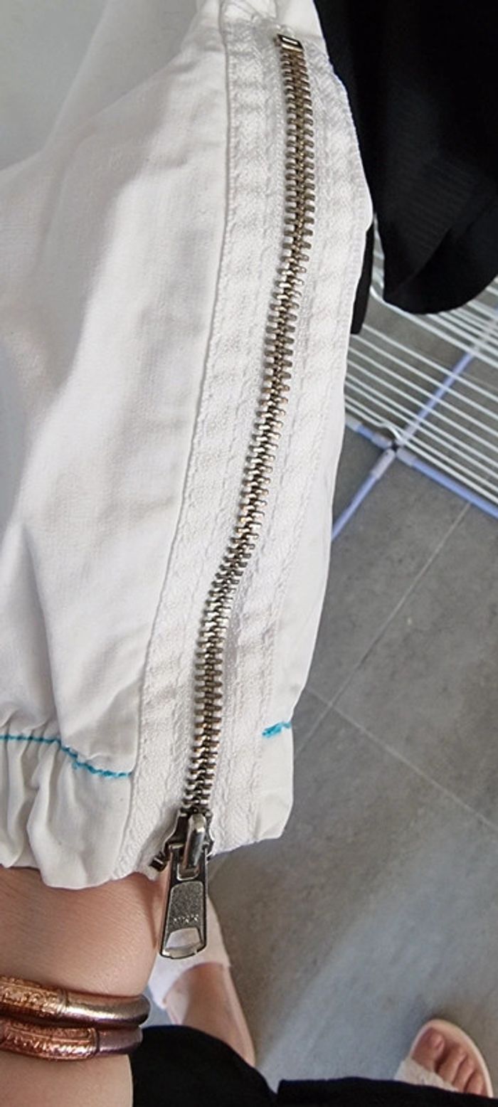 Très joli pantacourt léger blanc avec poches. Idéal pour l'été 🌞. Il est fermé par un zip et un bouton. Les jambes sont resserrées dans le bas par élastiques intégrés et il y a des zips qui s'ouvrent pour plus d'aisance au niveau du mollet. Le pantalon a des coutures contrastantes turquoises ce qui lui donne du charme. Taille 32 américaine,correspond à un 40, TEDDY SMITH Excellent état. N'hésitez pas à regarder le dressing qui est classé par catégories et à me demander tout n'est pas en ligne. Vous pouvez aussi vous abonner je publie régulièrement des nouveautés 😀 Remise en main propre possible sur Vannes et alentours ou envoi rapide et soigné. Prix 8 € #angita56_quarantefemme #angita56_ete