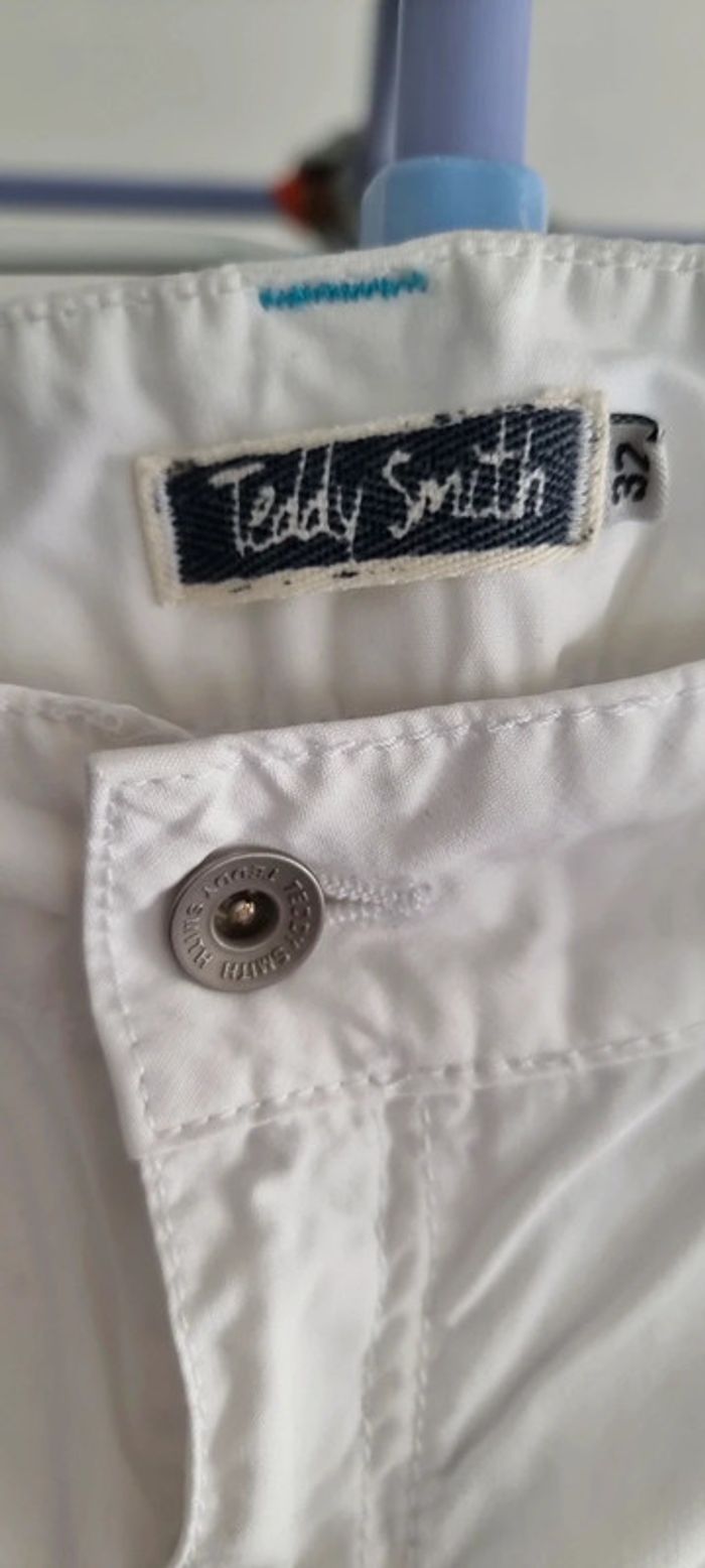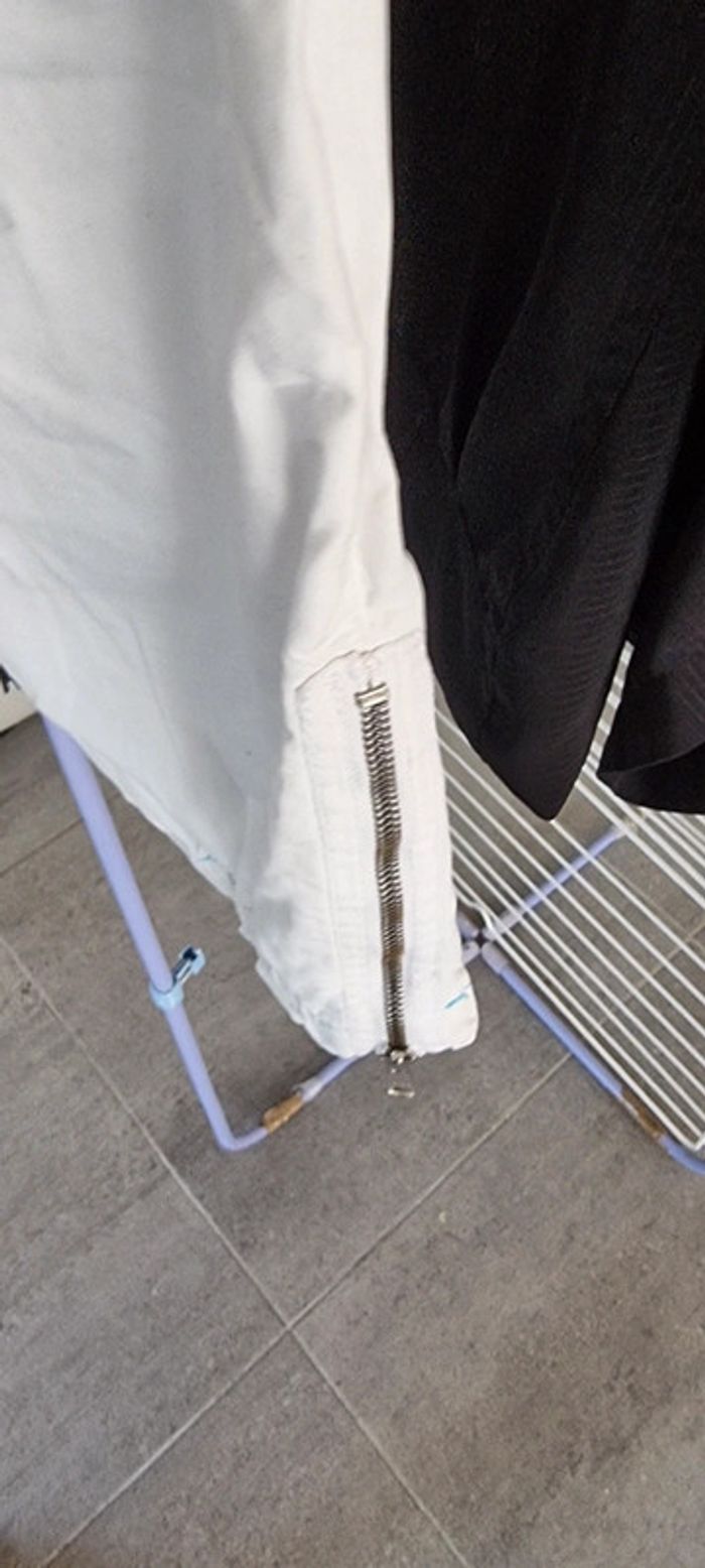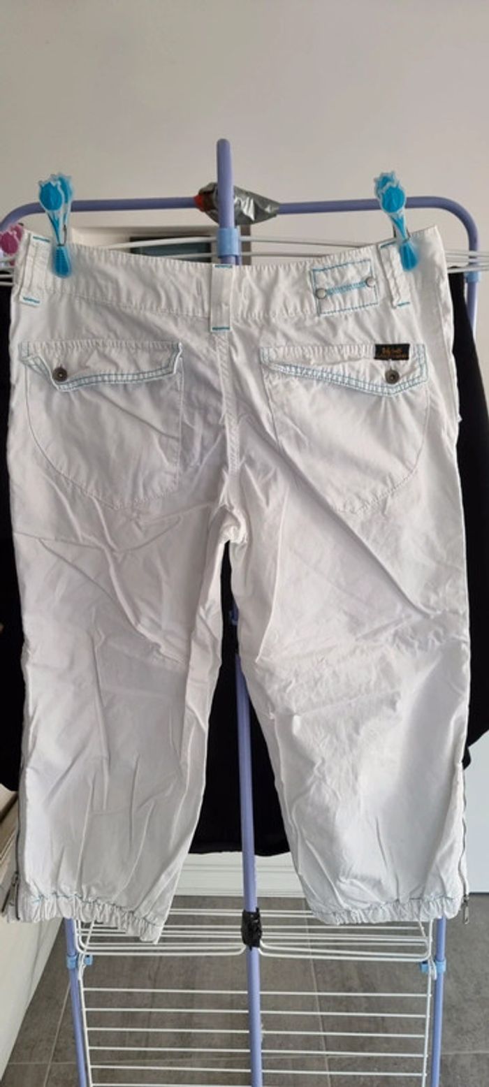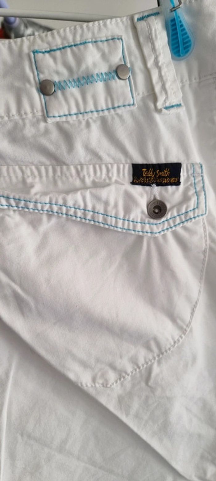 Très joli pantacourt léger blanc avec poches. Idéal pour l'été 🌞. Il est fermé par un zip et un bouton. Les jambes sont resserrées dans le bas par élastiques intégrés et il y a des zips qui s'ouvrent pour plus d'aisance au niveau du mollet. Le pantalon a des coutures contrastantes turquoises ce qui lui donne du charme. Taille 32 américaine,correspond à un 40, TEDDY SMITH Excellent état. N'hésitez pas à regarder le dressing qui est classé par catégories et à me demander tout n'est pas en ligne. Vous pouvez aussi vous abonner je publie régulièrement des nouveautés 😀 Remise en main propre possible sur Vannes et alentours ou envoi rapide et soigné. Prix 8 € #angita56_quarantefemme #angita56_ete
