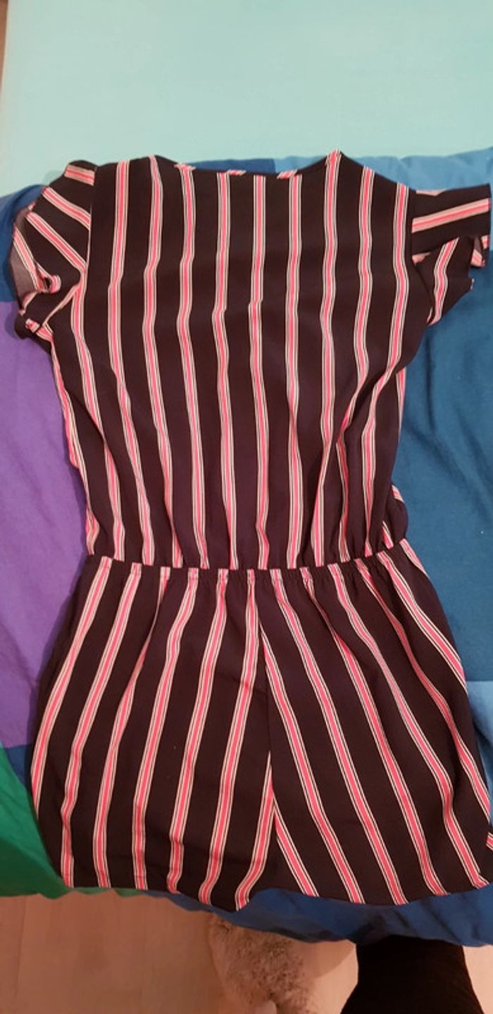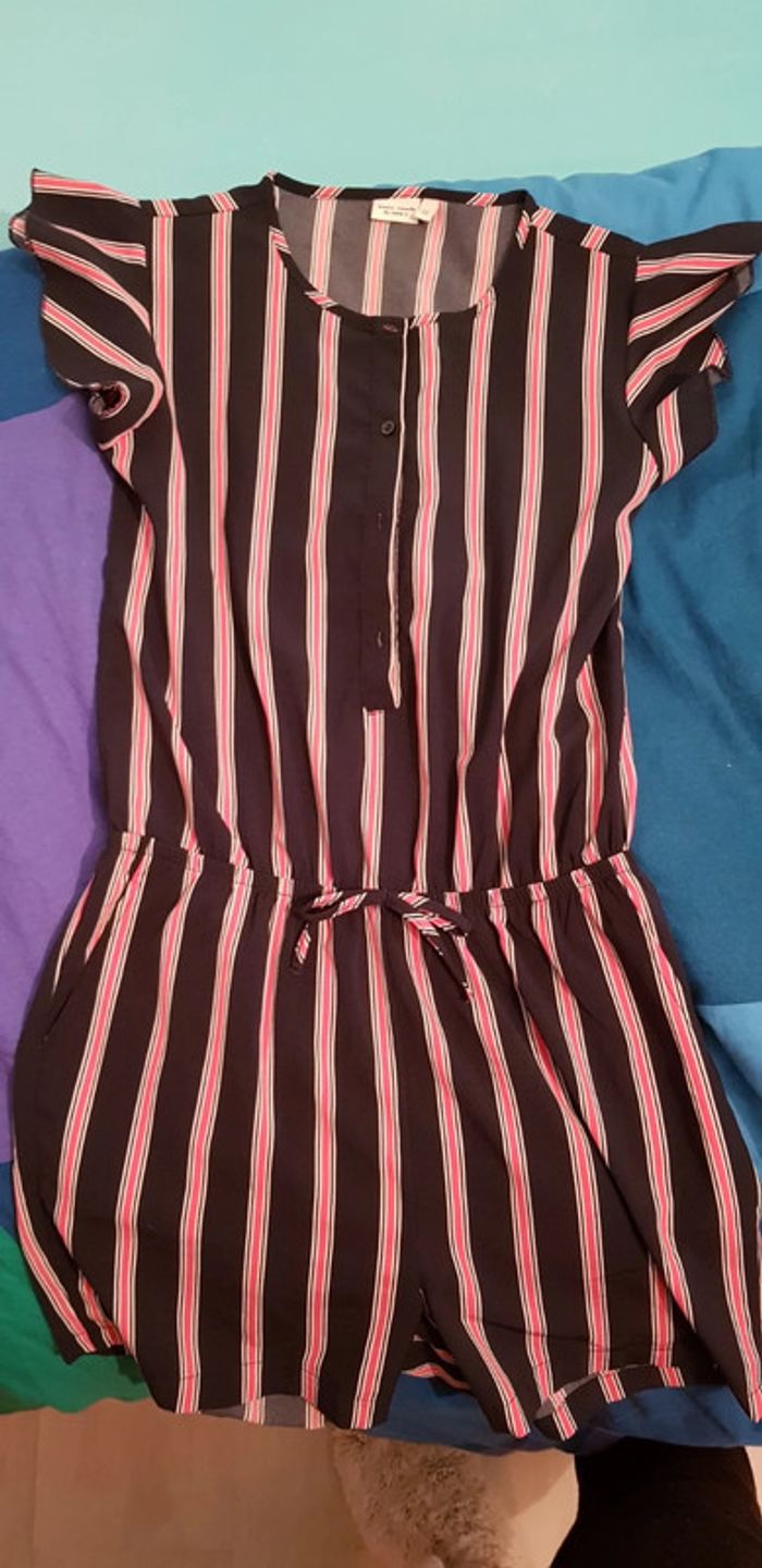 Combinaison à manches courtes avec des rayures, taille 12 ans. Boutonnée devant sur le buste pour l'ouvrir et taille élastique. Tissu de belle qualité. Petit noeud à la taille et 2 poches sur les côtés. Excellent état. Remise en main propre possible sur Vannes et alentours ou envoi rapide et soigné. Prix 5 € #angita56_douzeansfille