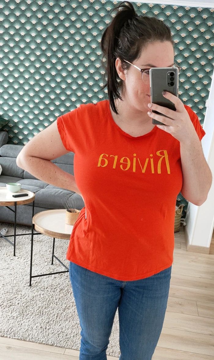 ▪️Taille 44, taille normalement ▪️Porté max 3 fois, comme neuf ▪️Acheté 17€ #tshirt #tshirtfemme #tshirtorange #tshirtcamaieu #camaieu #fashion #style #mode #look #tendance #femme #vetementsfemme #grandetaille #orange