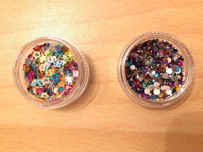 By Sabrina Azzi manucure 3 vernis de 5 ml chacun : rose, blanc, beige clair 2 boites de décorations multicolores: strass et formes (étoiles, fleurs, coeurs, lunes)