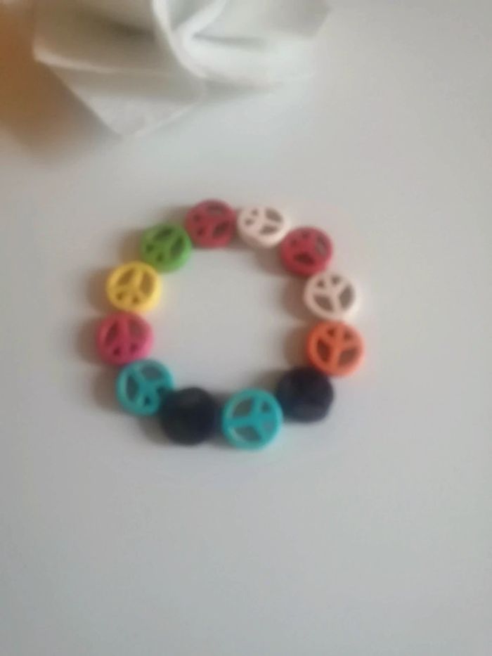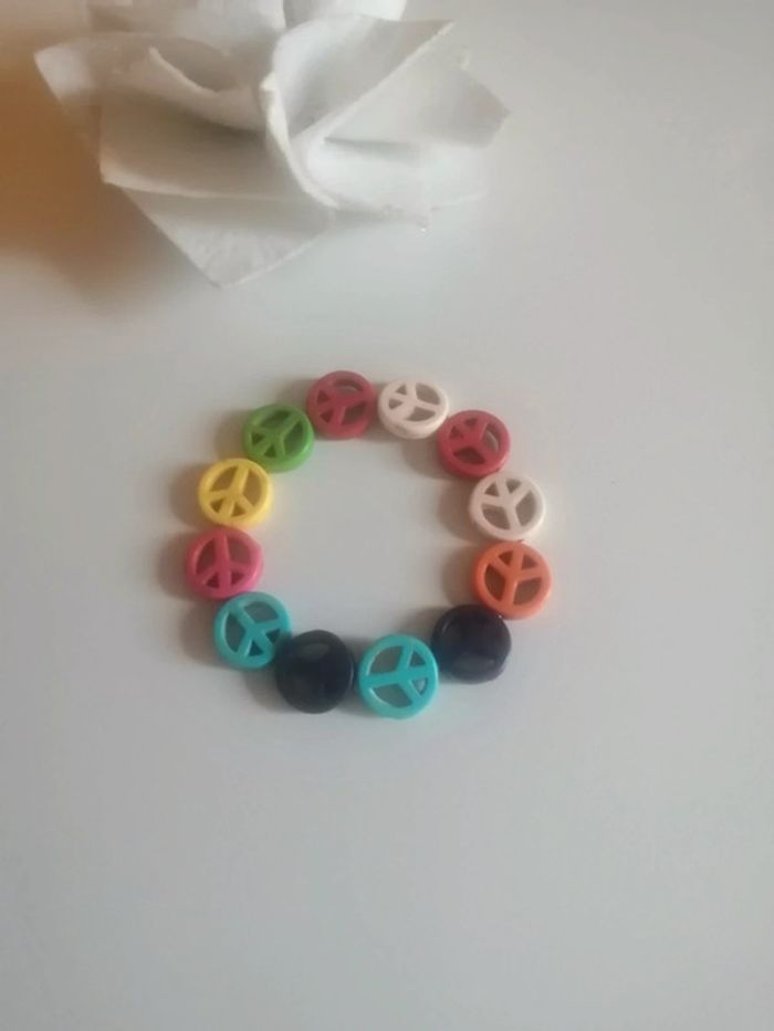 🌸Très bon état, porté une fois par ma fille 🌸Bracelet extensible, bois coloré 👁️‍🗨️Regardez les autres bijoux pour optimiser vos frais de port #fleurette6767bijoux 👁️‍🗨️ #paix #braceletextensible #symbolepaix #symboleamour #braceletsignedepaix #amour #braceletcolore