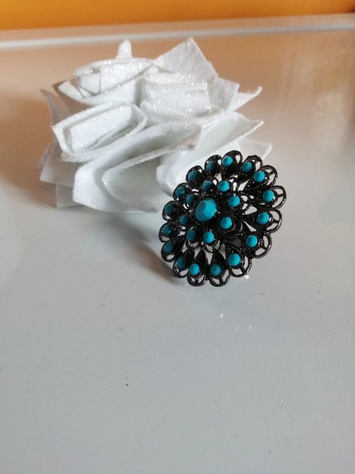 🌸Bague ronde fleur ornée de cristaux turquoise Seventies Taille 60 "Vintage" - photo numéro 1