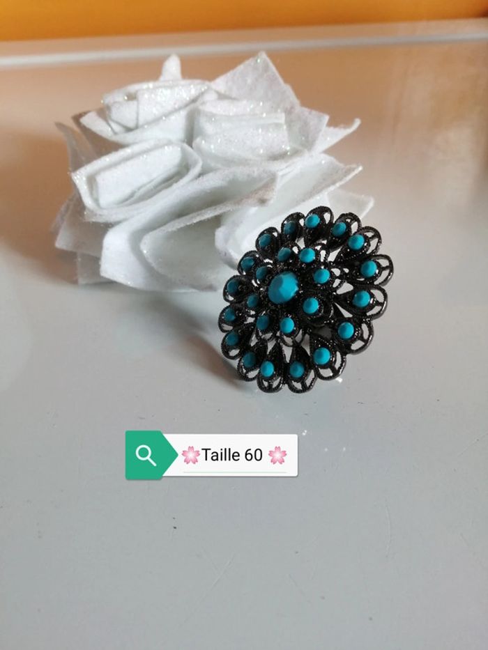 🌸Bague ronde fleur ornée de cristaux turquoise Seventies Taille 60 "Vintage" - photo numéro 2
