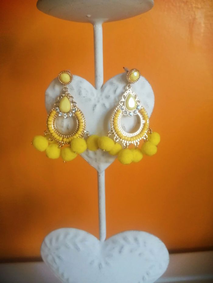 🌸Boucles d'oreilles dorées chandelier à pompons jaunes "Etsy" 🌸 - photo numéro 1