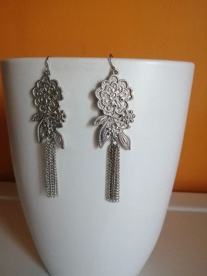 🌸Boucles d'oreilles argentées fleurs et multi chaînes pendantes Neuves 🌸 - photo numéro 2