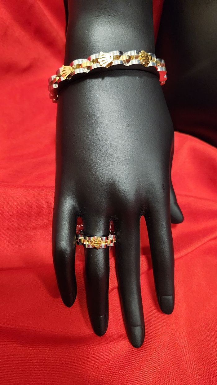 T vuNeuf jamais portée , en acier inoxydable 316L Alliant le doré et l'argenté ,très chic parure avec un bracelet rigide