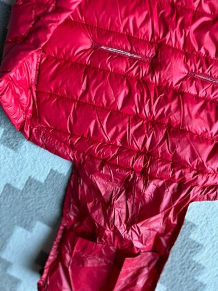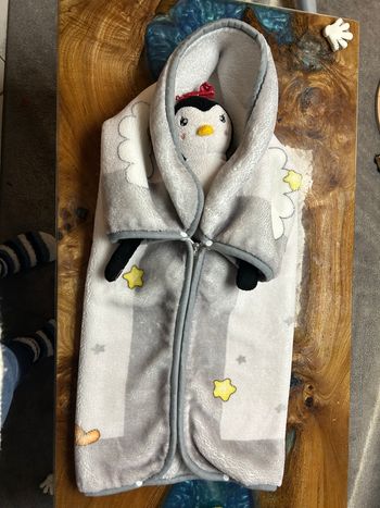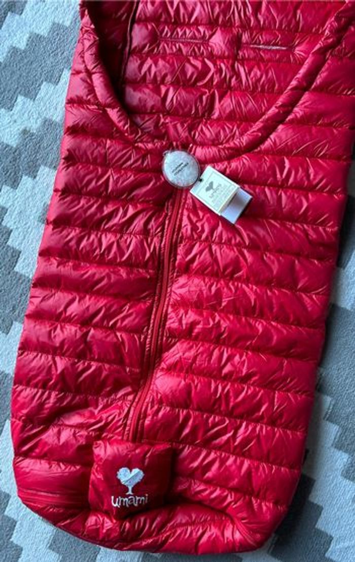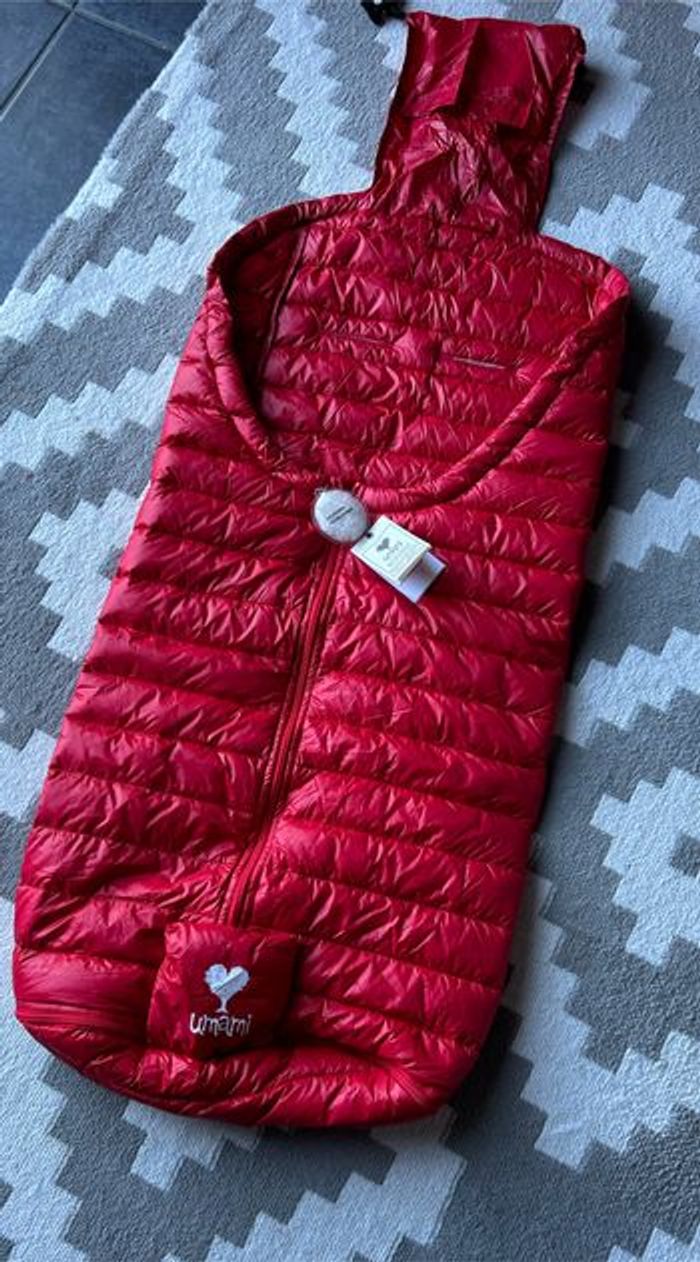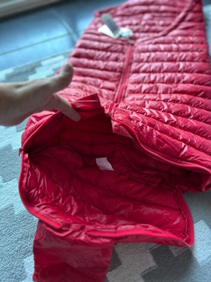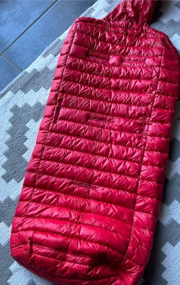 Très belle chancelière prend pratiquement pas place se glisse facilement dans le sac à langer ou boîte à gants 90 % duvets et 10 plumes très légère mais très chaude très légère sur l enfant valeur 165 e très pratique si besoin d ouvrir le bas pour les après ski peu facilement rester au siège auto vu qu elle est très fine comme les doudoune