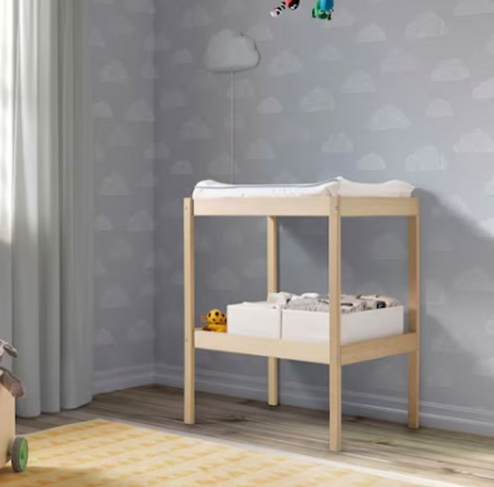 A vendre lit enfant modèle STUVA de chez IKEA, avec ses tiroirs et son matelas model JÄTTETRÖTT état neuf il est accompagné de la table à langer model SNIGLAR , toujours de chez IKEA , équipéE de son matelas SKÖTSAM + poubelle à couches Tomme Tipee et accessoire de recharge. Possibilité de donner alèse et drap housse propres.