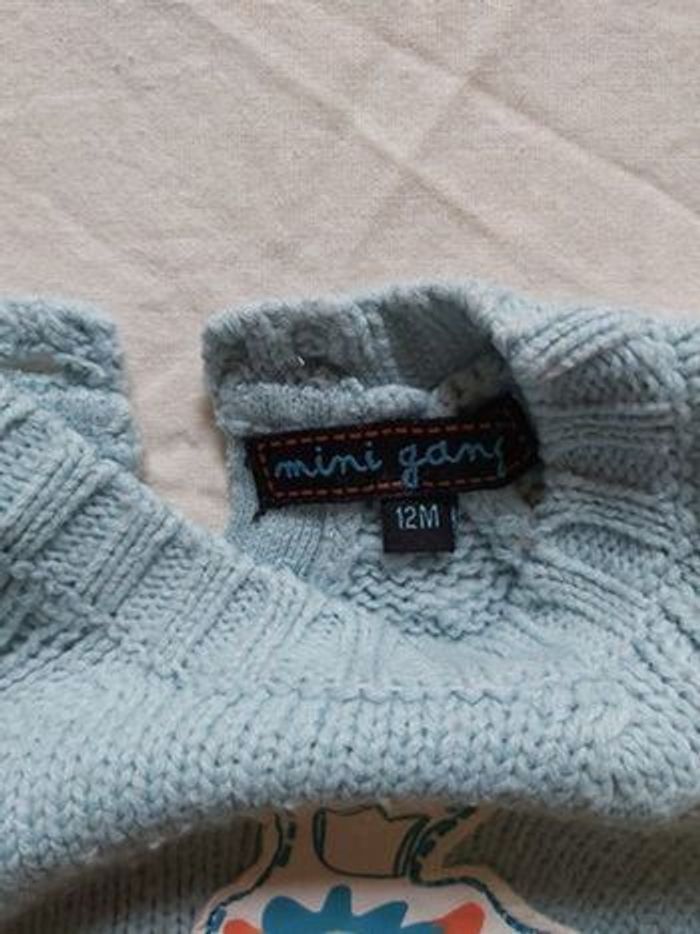 Pull Taille 12 mois Ouverture par bouton dans le dos Quelques bouloches Couleur bleu clair et blanc avec motif Marque Mini gang