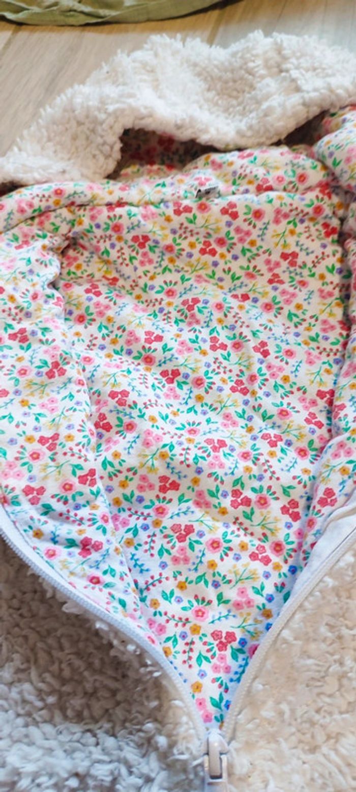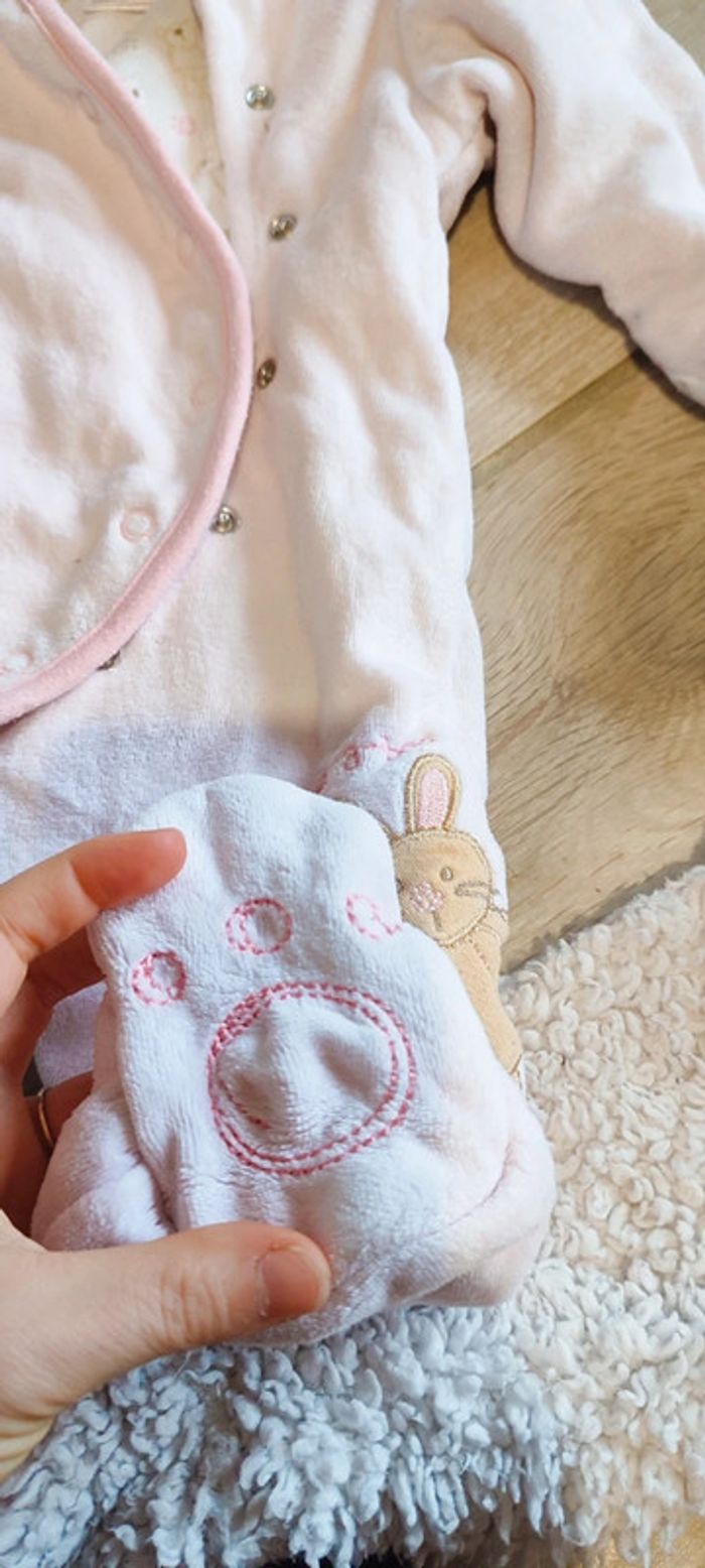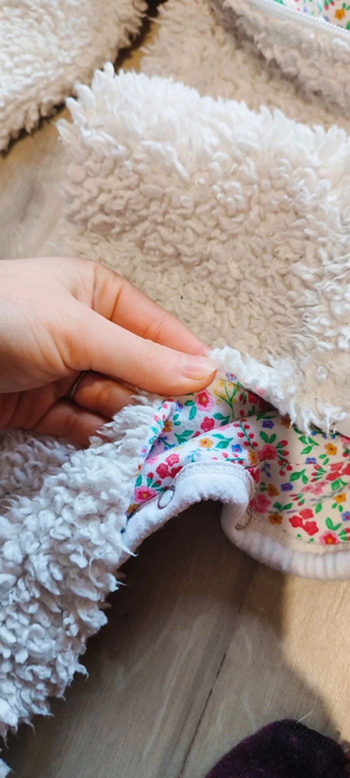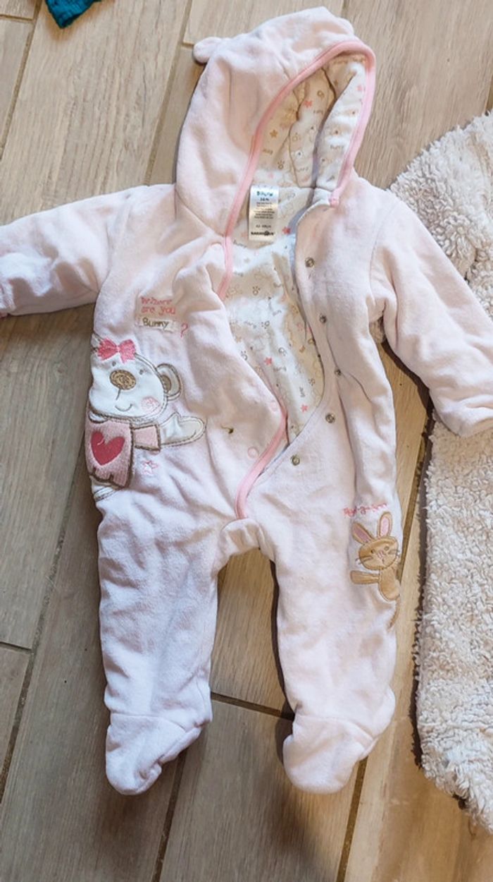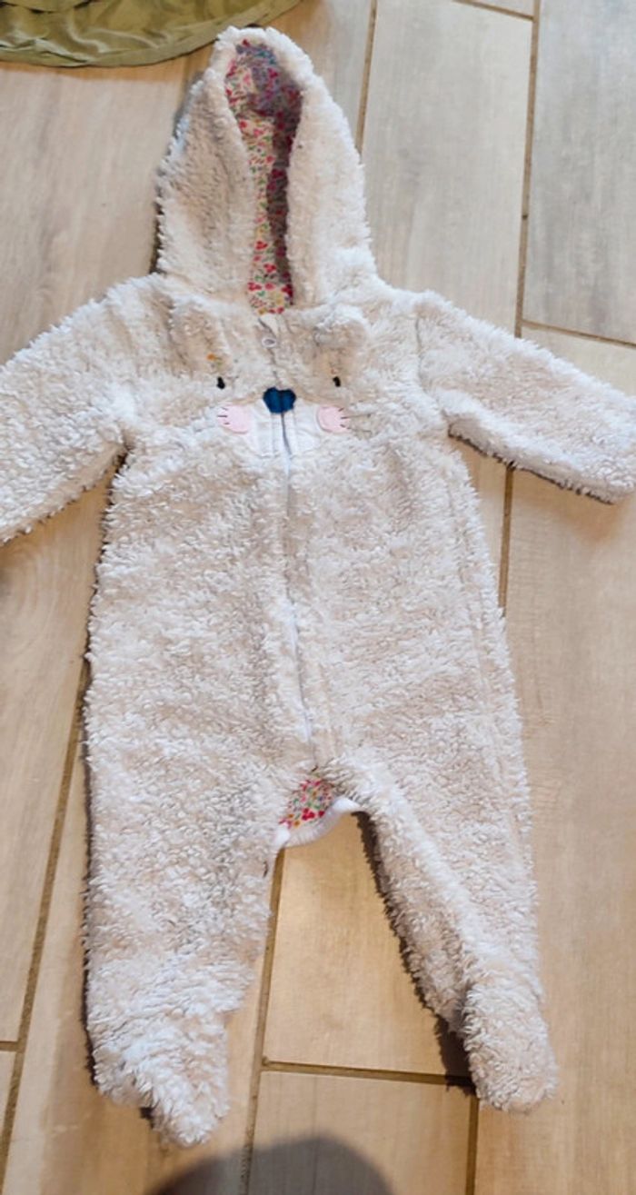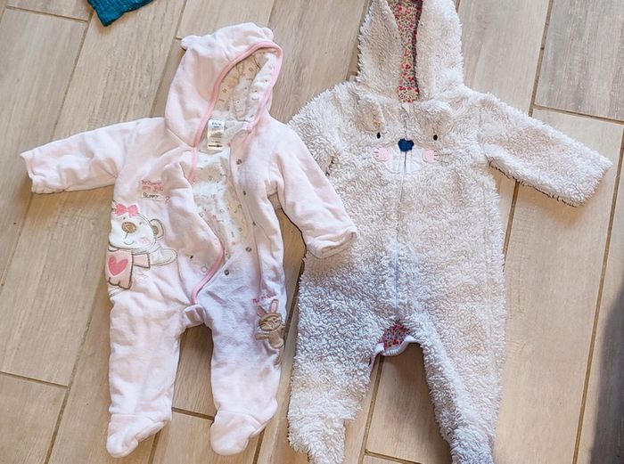 Deux combinaison , grenouillère Une 3/6mois (rose ) polaire a l'extérieur coton a l'intérieur , les manches peuvent se rabattre pour cacher les mains , avec pieds , capuche a oreilles. Très bon état L'autre combi taille 6 mois. A fourrure intérieur coton . Elle n'est plus aussi blanche mais toujours jolie . Intérieur coton a fleurs . Pressions pour changer la couche capuche et pieds . Petit prix pour un bébé au chaud 🥰