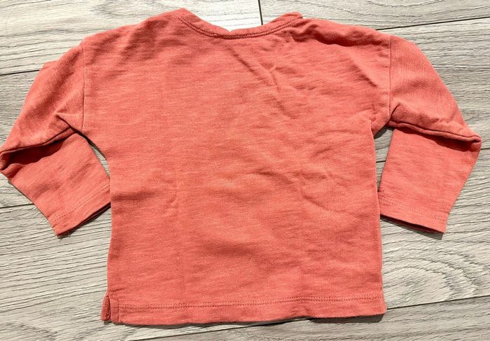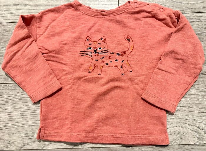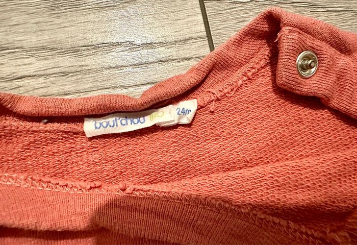 Sweat léger, Marque boutchou Taille 24 mois Couleur corail avec motif chat, boutons pressions sur le côté du col.
