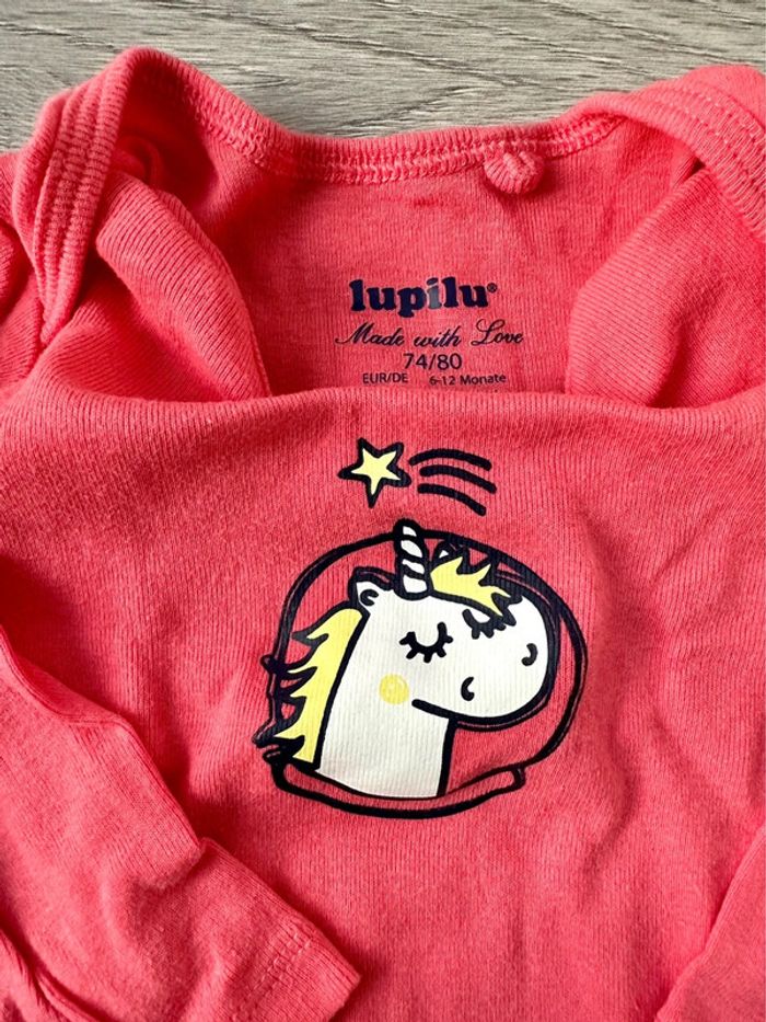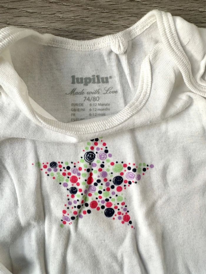 Lot de 2 bodies, marque Lupilu Noté 6-12 mois, mais correspond plus à un 12-18 mois. Très bon état