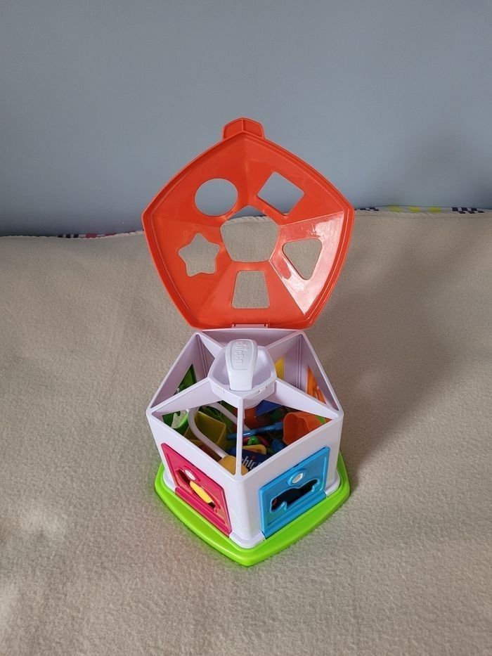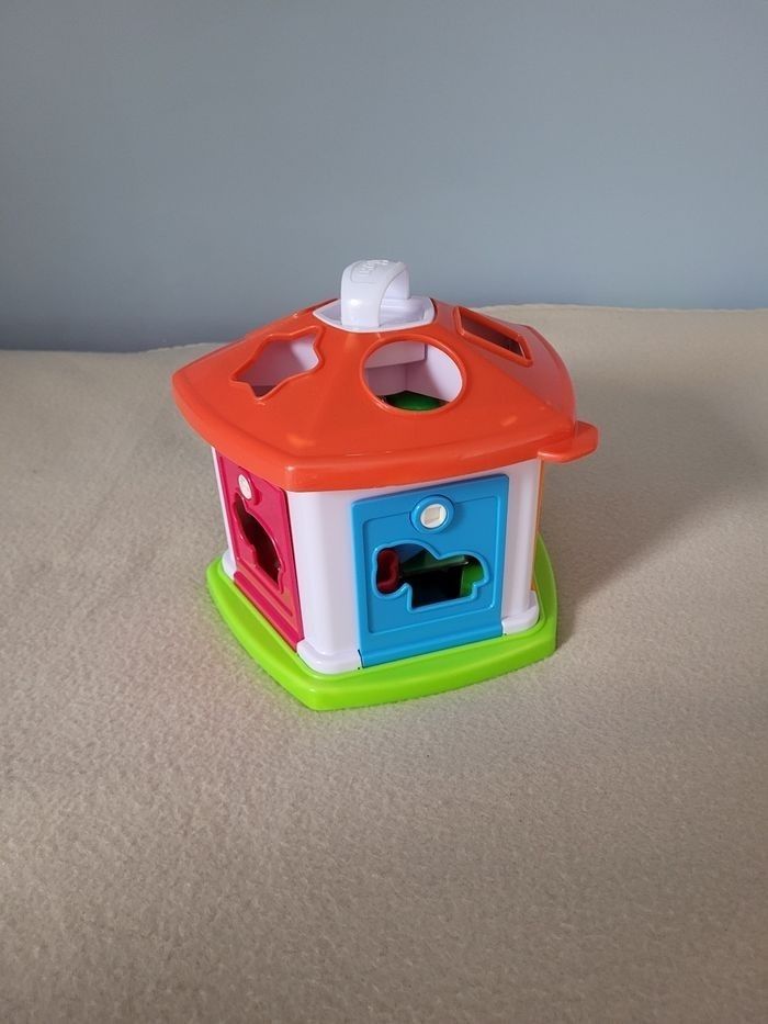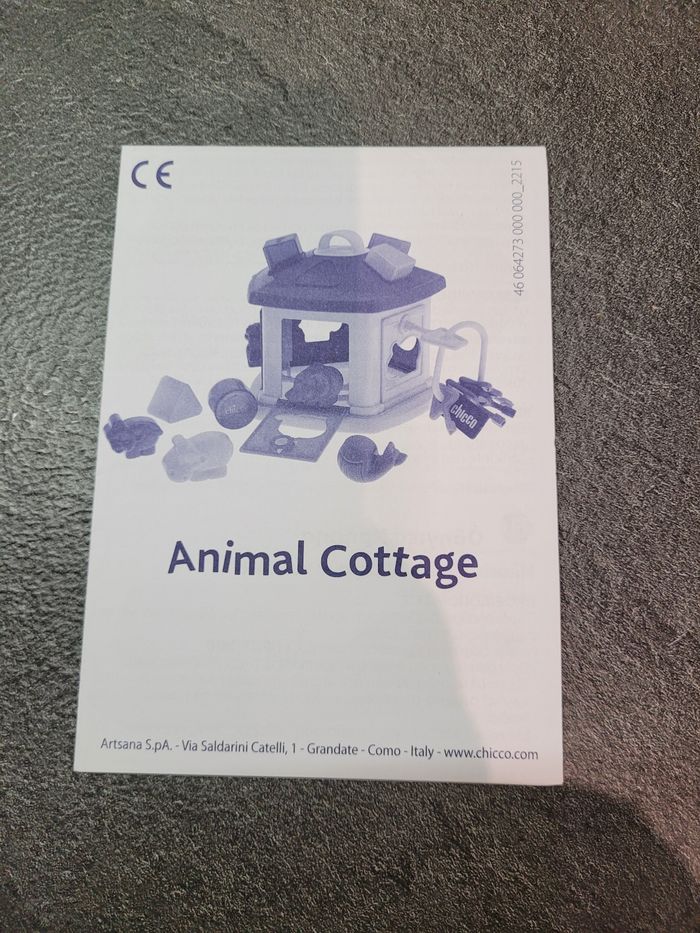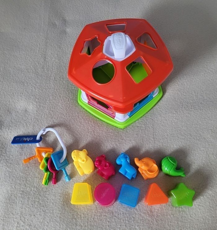 Jeu chicco cottage des animaux 10 formes et animaux colorés 5 clés colorés qui permettent d'ouvrir les portes de la maison et le toit amovible pour récupérer les formes En très bon état A partir de 12 mois Notice fournie