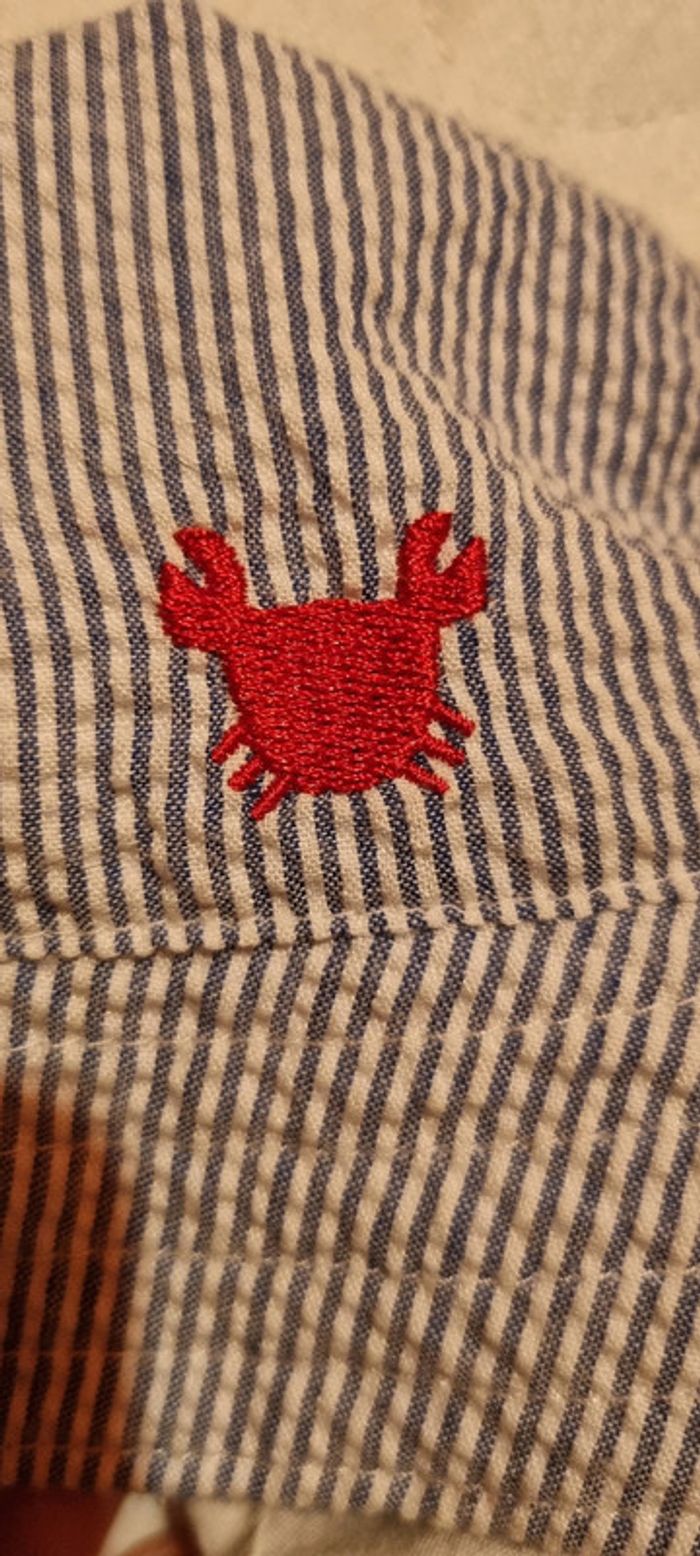 Bob marin/marinière été avec son petit écusson crabe brodé. Très bon état. Protege bien du soleil. Bleu et blanc. A noté, le prénom de mon fils à l'intérieur inscrit au tampon encreur effaçable. Taille 50