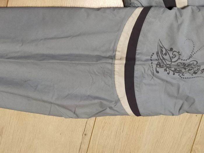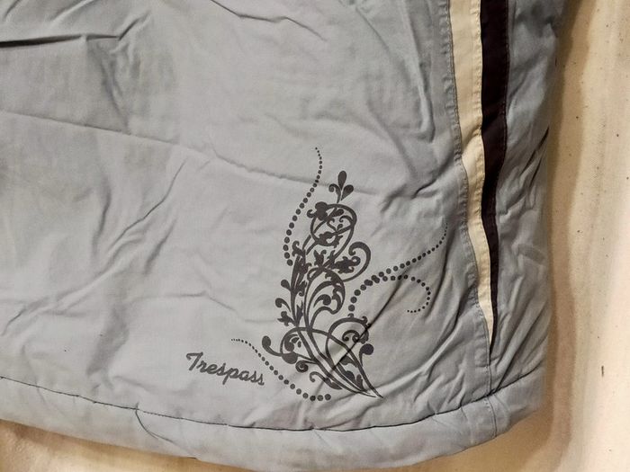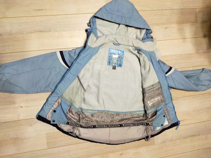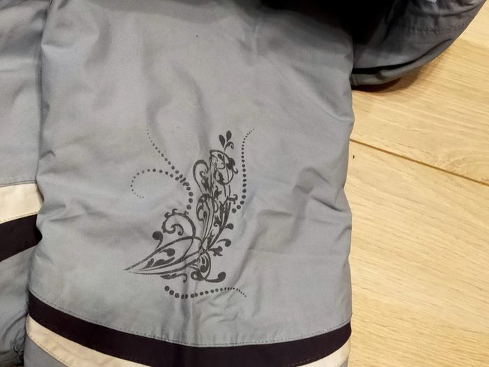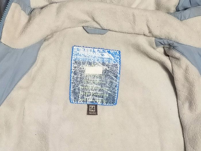 Manteau de ski bleu clair de marque Trespass avec capuche. Elastique présent à la taille Dessin de fleur à l'arrière droite et sur une manche. Ouverture par fermeture éclair sous les bras pour une meilleure aération durant le ski. Taille 14 ans En excellent état, à noter toutefois la présence d'une légère tache noire sur la manche (voir dernière photo)