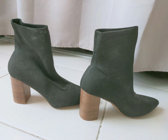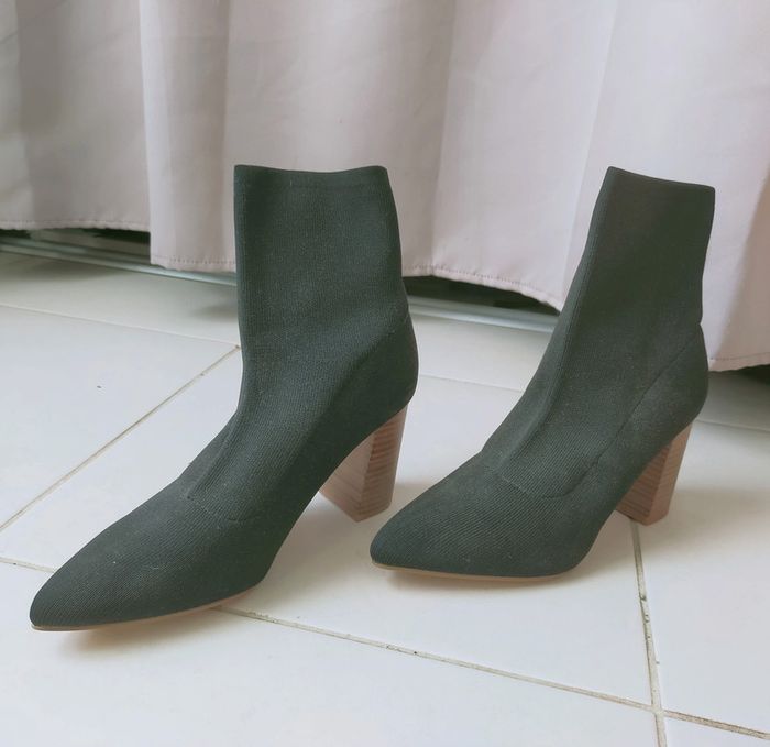 Boots noires de chez Pimkie en simili tissus. Taille 40. Boots très peu servi, comme neuve ( voir semelle) Hauteur du talon : 9 cm Elles sont en très bon état, remarque toutefois la présence de traces de colle sur le haut d'une des pairs.
