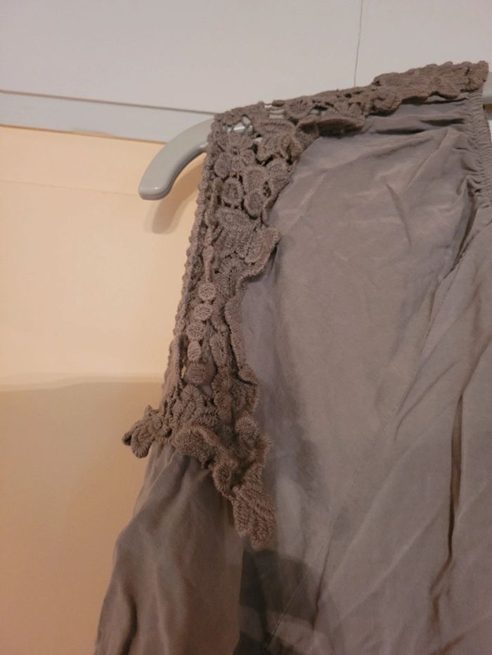 Manches longues retroussables Encolure elastiquee, pouvant se mettre épaules dénudées Manches raglan Belles finitions en tissu style macramé sur le haut des manches 65 cm aisselle à aisselle