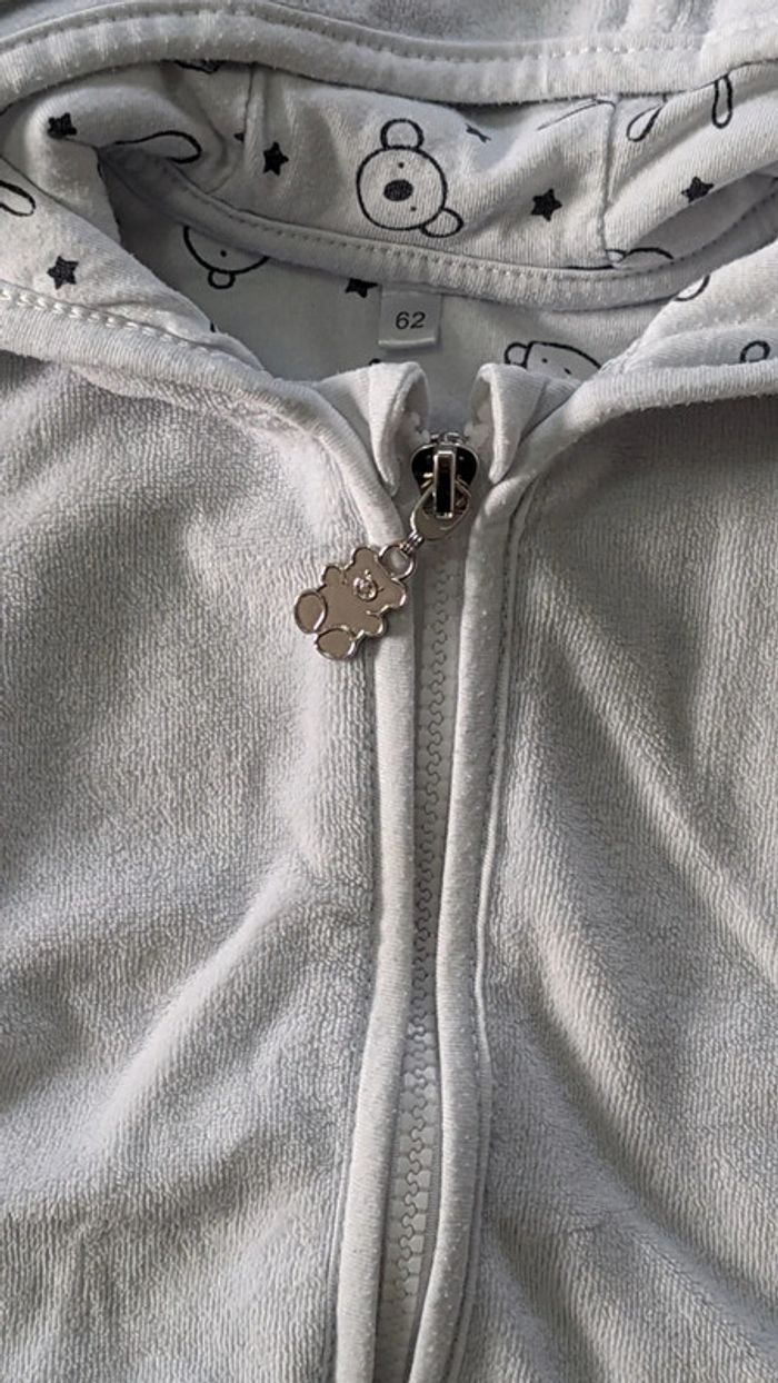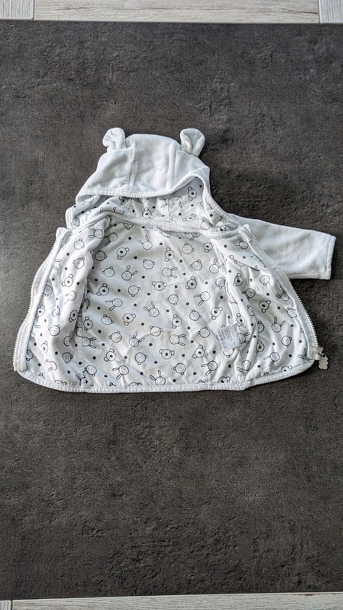 Gilet hiver en velours à manche longue avec capuche à oreilles. Ouverture sur le devant avec zip en forme de nounours. Taille 62cm. Acheté neuf. Tissu 80% coton 20% polyester. Doublure intérieure 65%polyester 35%coton
