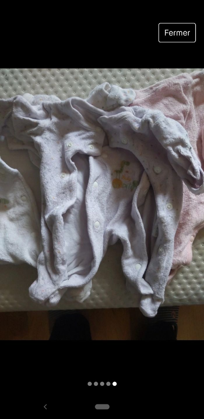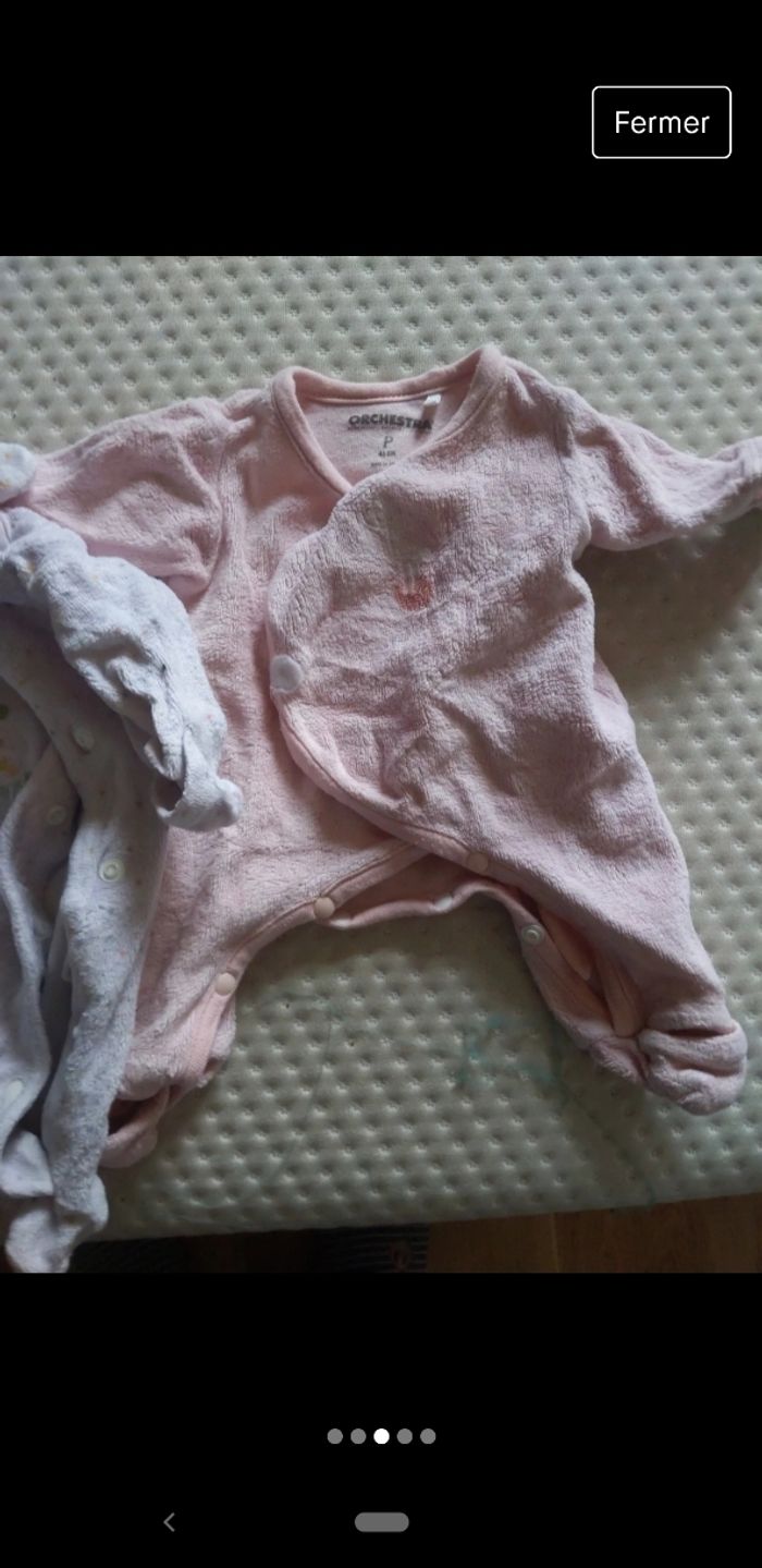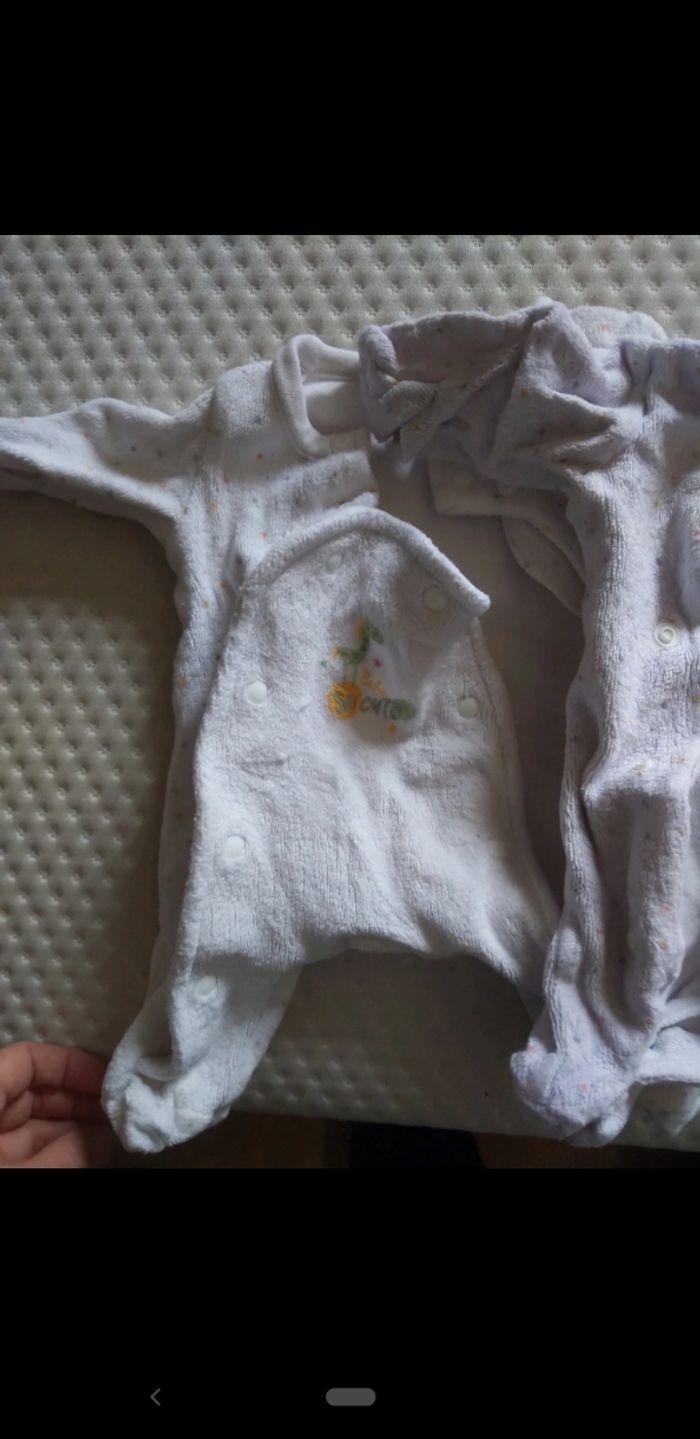 Vend lot de 3 pyjamas prématurés. Il y a un pyjama où la couleur blanche est un peu passée. Mais sinon ils sont en très bon état.