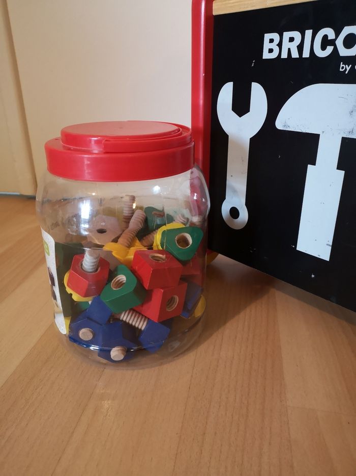 Établi à pousser Janod + ceinture d'outils Lidl. L'établi à déjà eu plusieurs vies d'où quelques accrocs sur le bois, mais bon état général. La ceinture d'outils quant à elle est quasi neuve car peu servi. Lot de vis et boulons vendu avec.