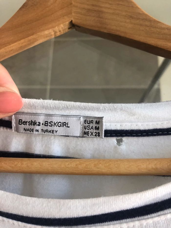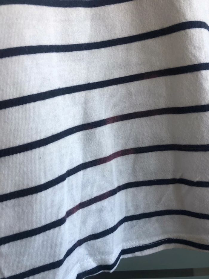 T-shirt marinière court (mais cache le nombril) Petit trous en bas (voir photos) et une ligne devant et derrière un peu délavées mais pas bcp visible #maarion37_femme