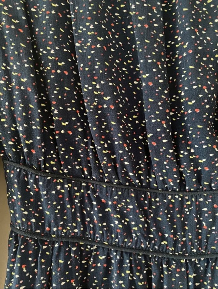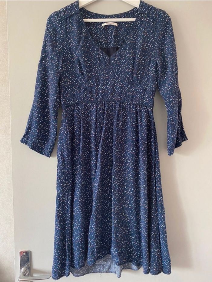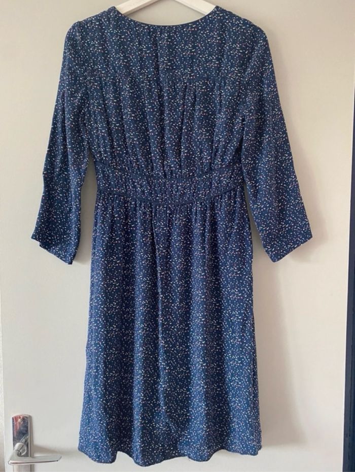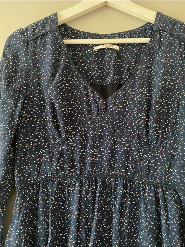 Jolie robe bleue marine à pois, manche 3/4 Taille 36/38 Très bon état Marque camaïeu