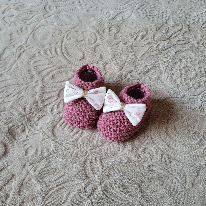Chaussons tricot taille 0/3mois couleur vieux rose et nœuds fleuris. Neufs