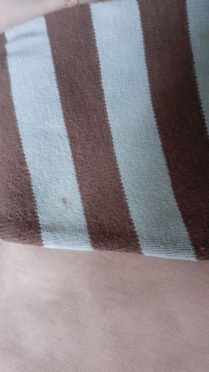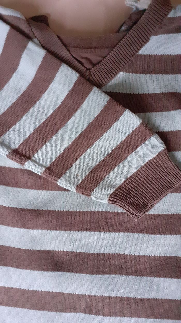 Vends un pull maille en coton bleu ciel à rayures grises marque Kimbaloo 18 mois. 2 petites taches indiquées sur les photos.