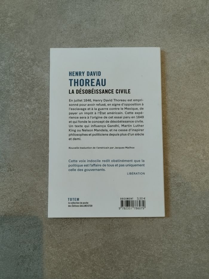 Bonjour, Je vends ce livre de henry David Thoreau la désobéissance civile en très bon état