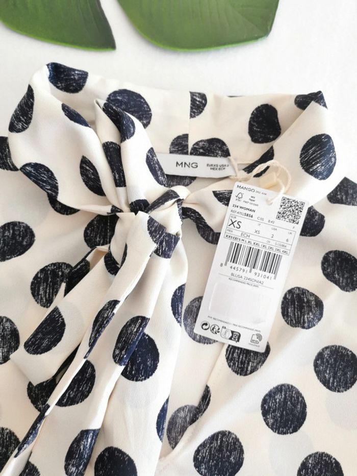 🙎‍♀️ ARTICLE NEUF AVEC ÉTIQUETTE 🙎‍♀️ Blouse à pois ⚫ Mango 👩 Taille XS • Matière: 100% polyester • Tissu voile, léger et fluide • Coupe droite • Manches longues boutonnées au poignet • Col en V avec longs liens à nouer 🎀 • Couleur: Écru/Beige clair à pois noirs ⚫⚫⚫ • 📏 Longueur: 60 cm • 📏 Mesure épaules: 38 cm • 📏 Mesure sous aisselles: 46 cm 💰Prix boutique: 29.99€ Parfait état👌, avec étiquette🏷️, jamais portée #SoStyLifemmeTailleXS ⬛