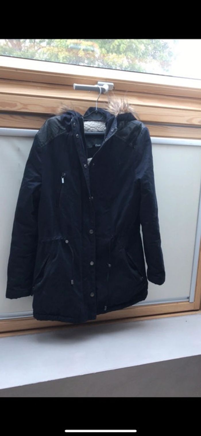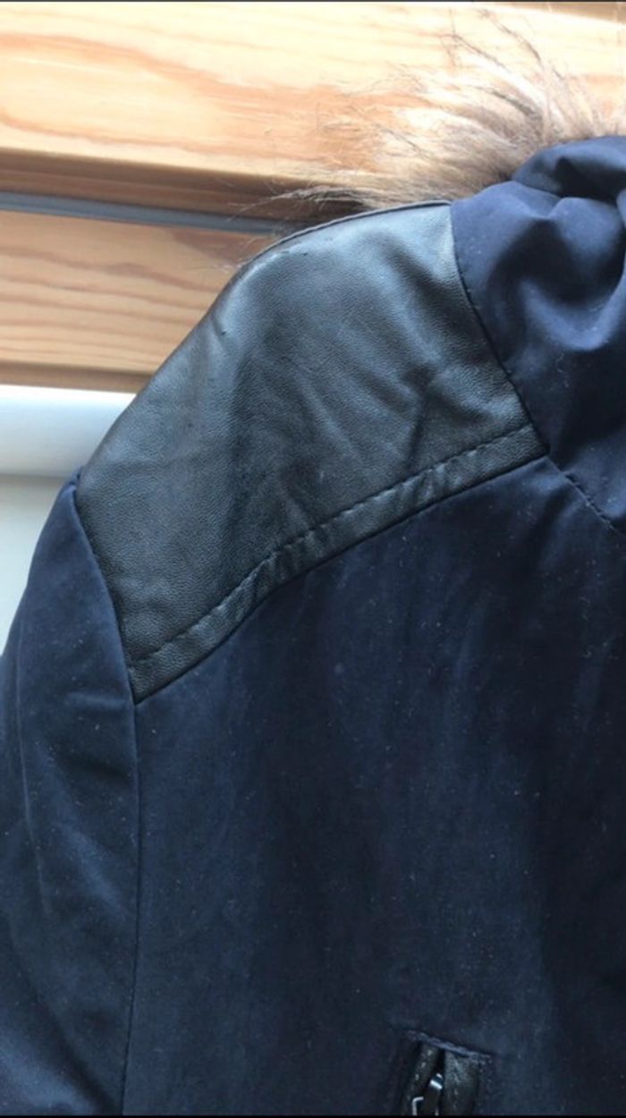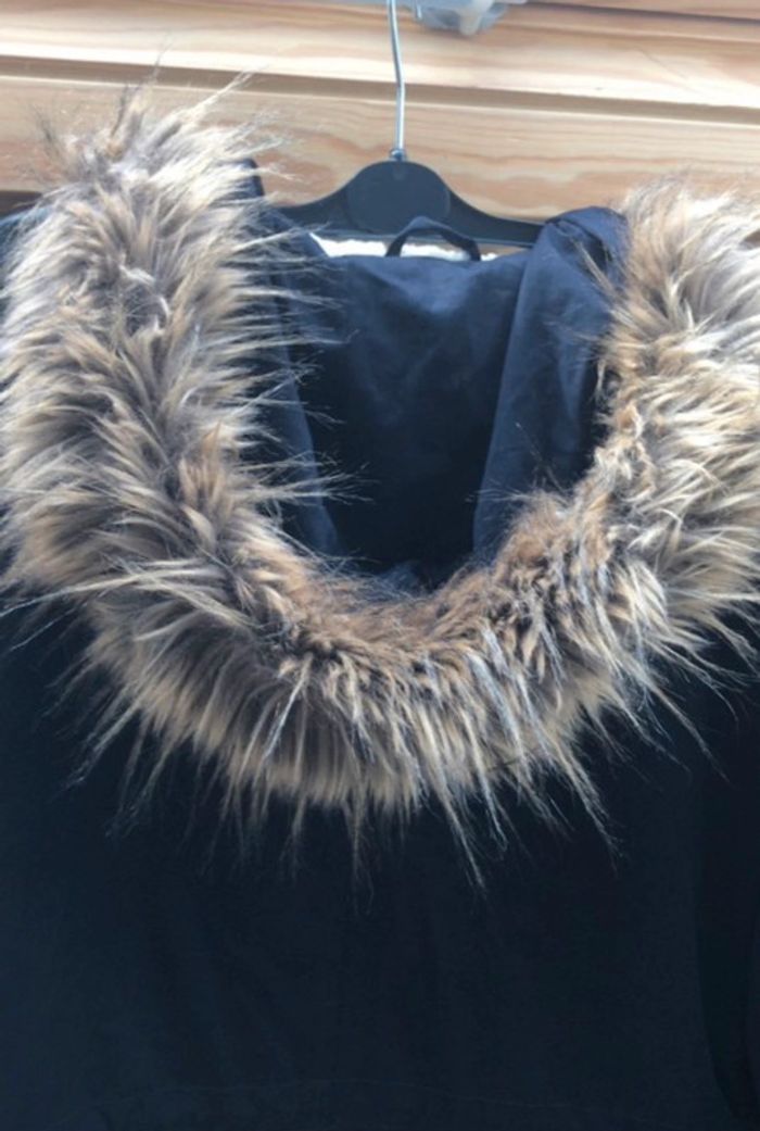 Blouson hiver à capuche bordure fourrure Etam t36 bicolore bleu marine avec épaules noires Doublé imitation fourrure à l’intérieur 2 poches sur le côté + poche pour cartes sur poitrine côté droit fermées par fermeture éclair Fermeture éclair + boutons pression Se resserre à la taille avec cordon excellent état