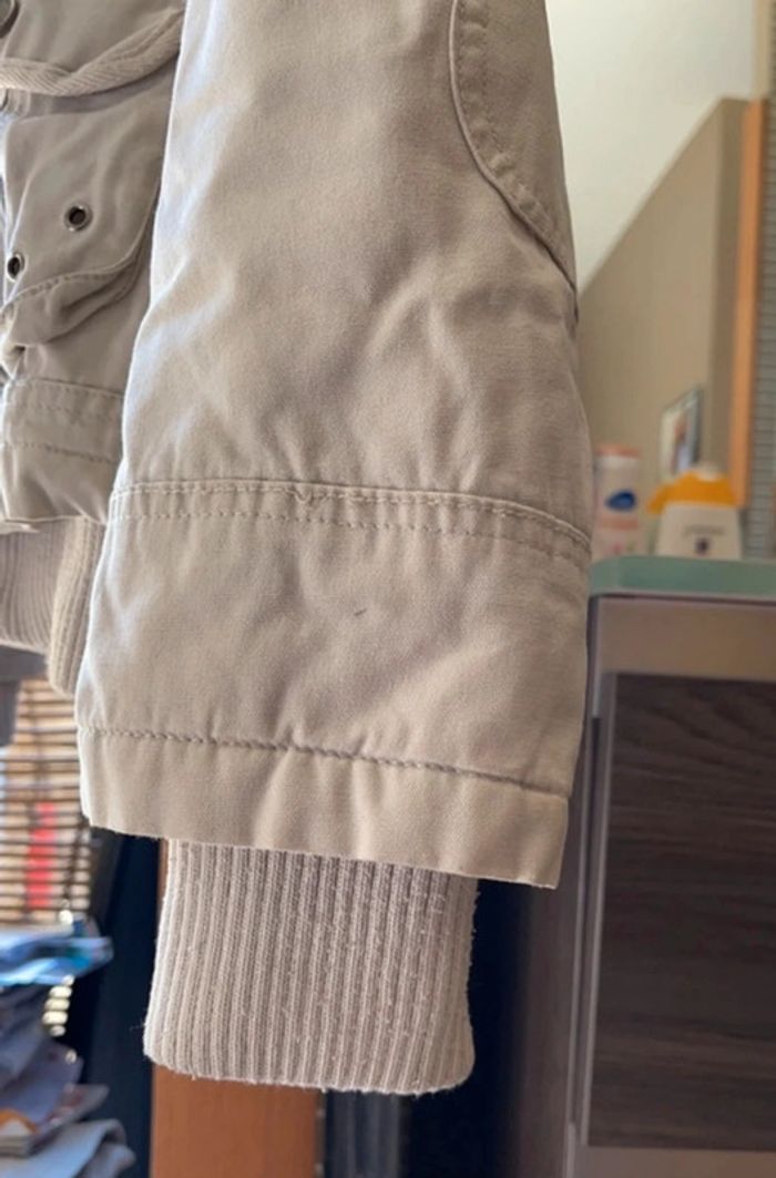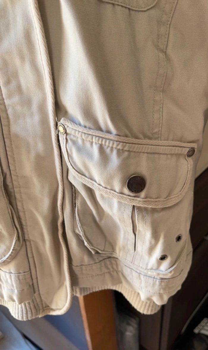 Blouson beige à capuche amovible fermeture éclair et boutons pression 4 poches : 2 devant et 2 poitrine Très bon état excepté un bouton pression à remplacer sur la capuche qui s’enlève BSK