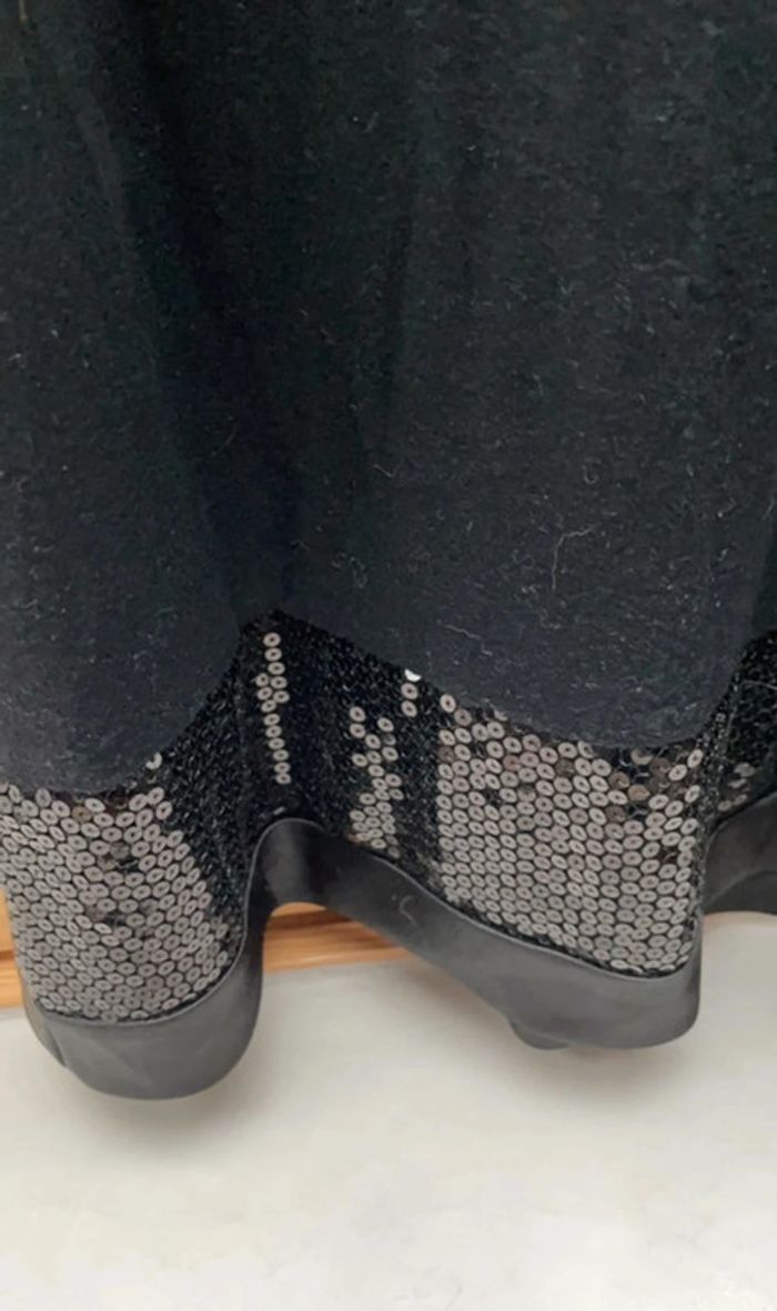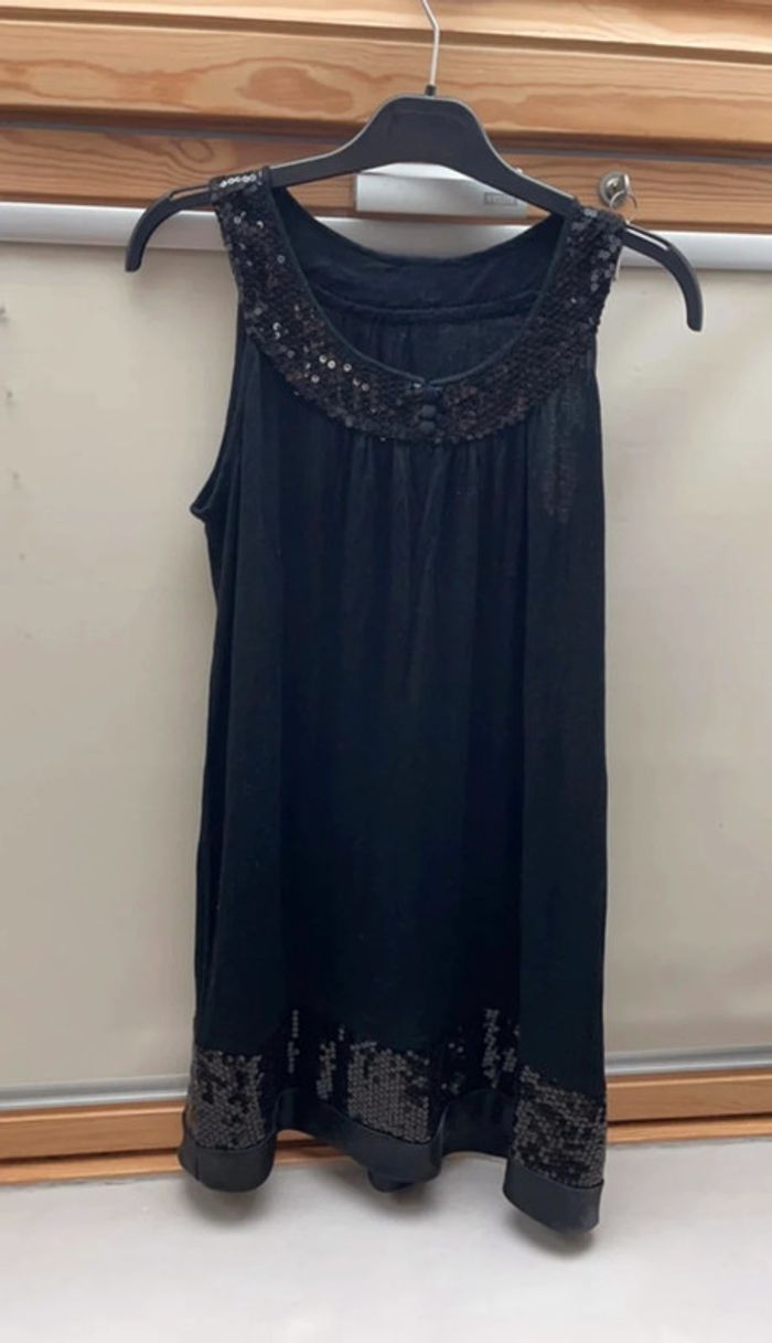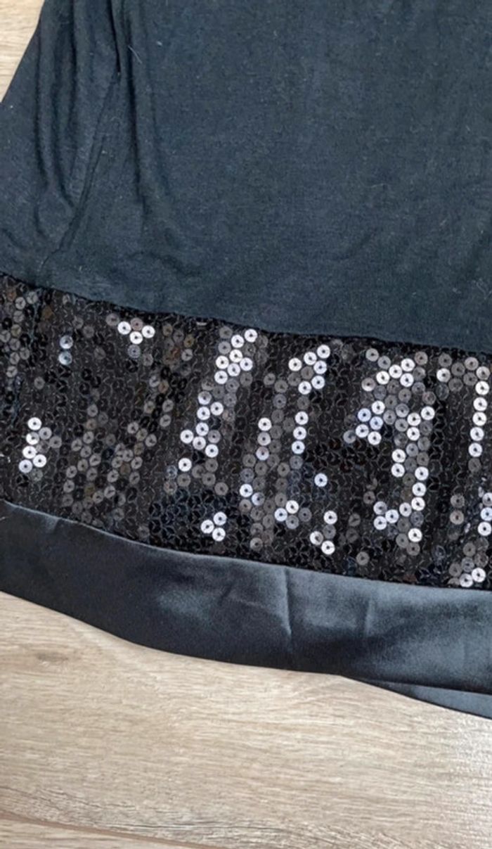 Petite robe noire en elasthane avec sequins brillants noirs en bordure du col et bas de la robe Longueur du haut col (dos) en bas :75 cm Tour de poitrine 80 cm CRO Envoi rapide