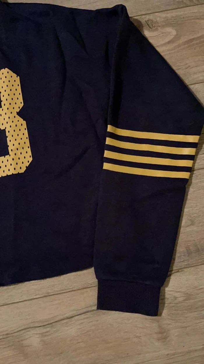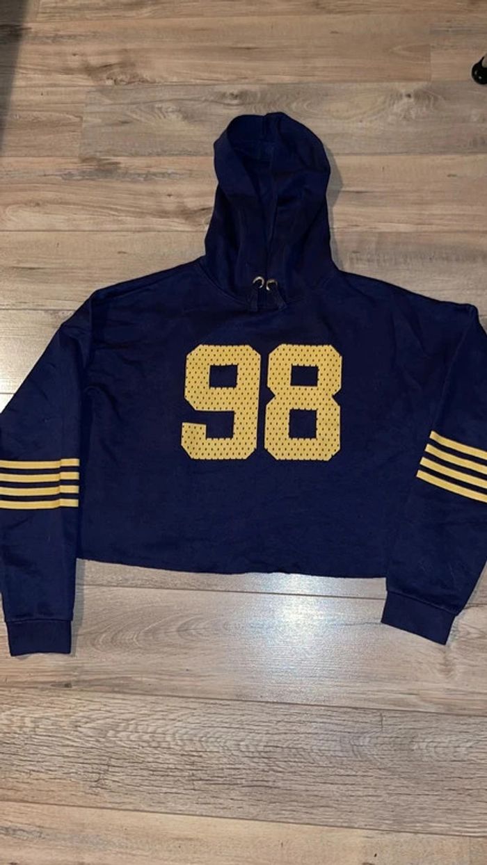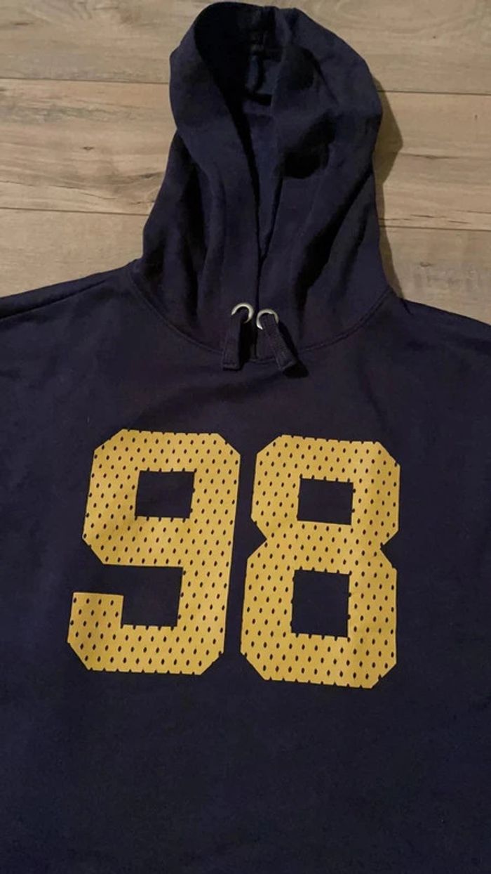 Sweatshirt à capuche et manches longues bleu marine - inscription 98 sur le devant et bandes sur les manches Excellent état CNV