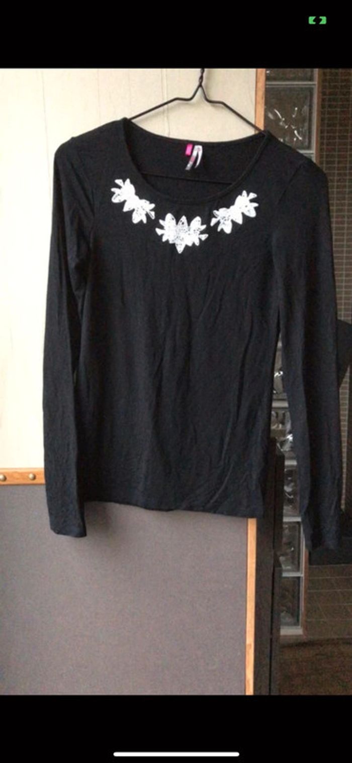 Tee-shirt à manches longues noir broderie blanche à l’encolure Orchestra