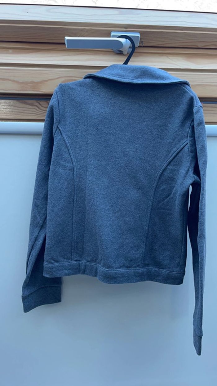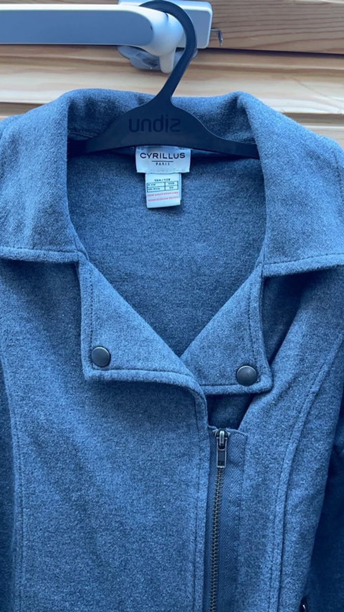 Veste grise à manches longues col chemise fermeture éclair sur le devant 2 poches fermées par fermeture éclair de chaque côté 100% coton très épais lavable en machine Excellent état portée une fois pour une occasion CLR
