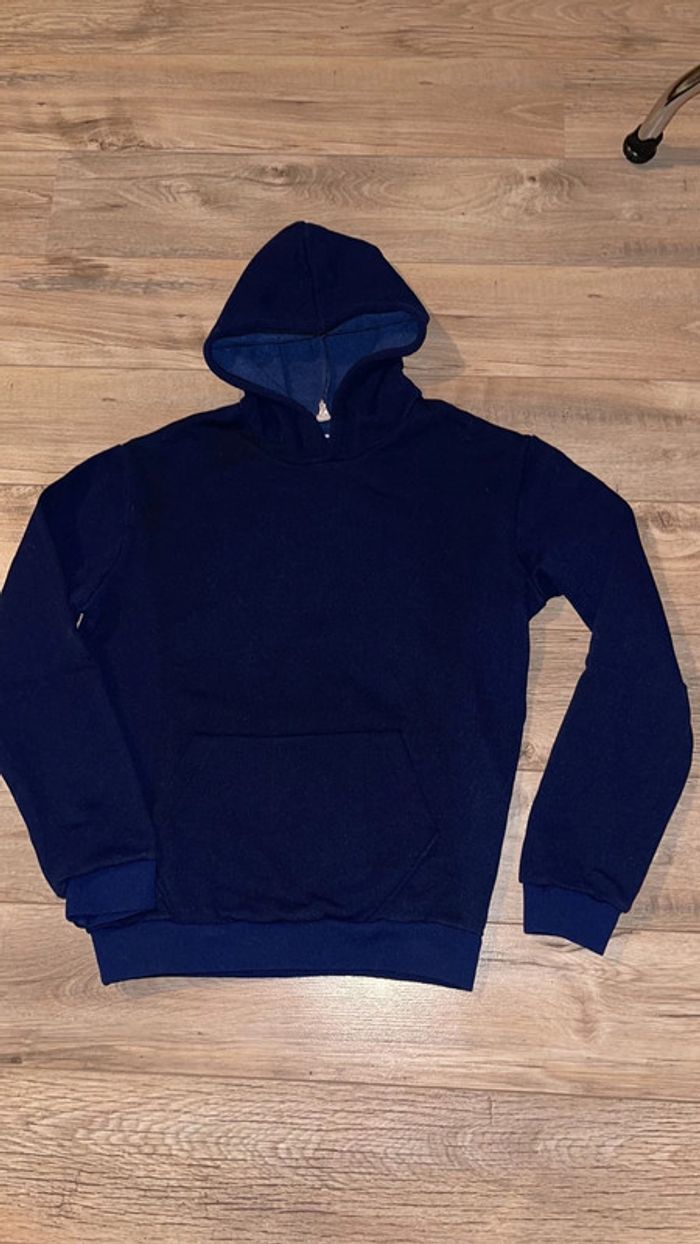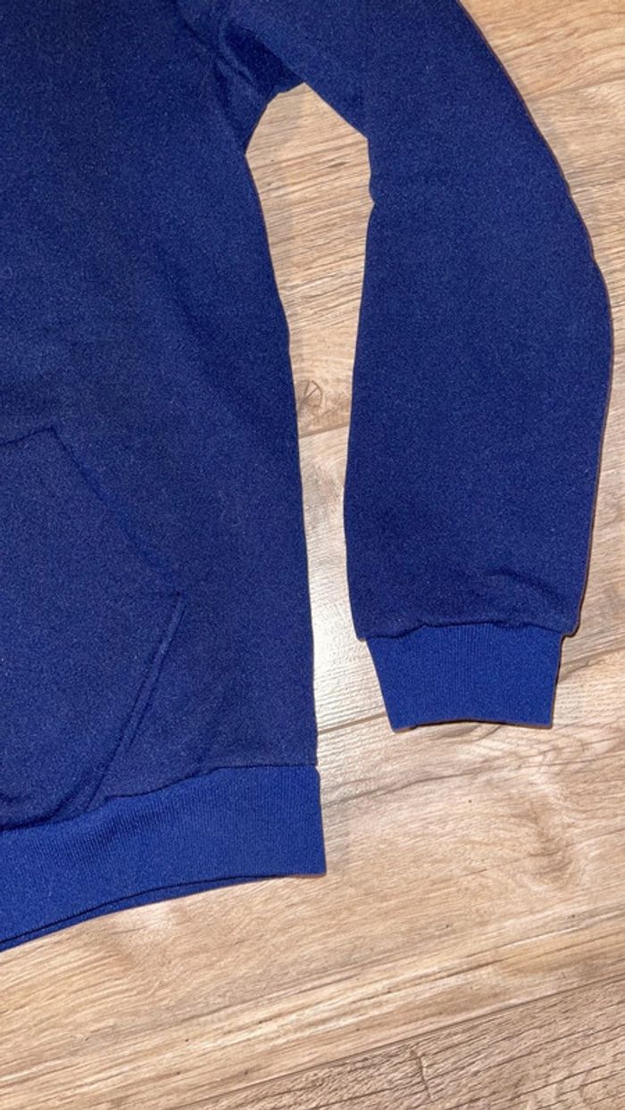 Sweatshirt bleu marine à capuche et manches longues - poche kangourou sur le devant - tour de poitrine : 90 cms - hauteur du col au bas du bord-cote : 55 cm - longueur des manches de l’épaule en bas : 53 cms Très bon état CNV