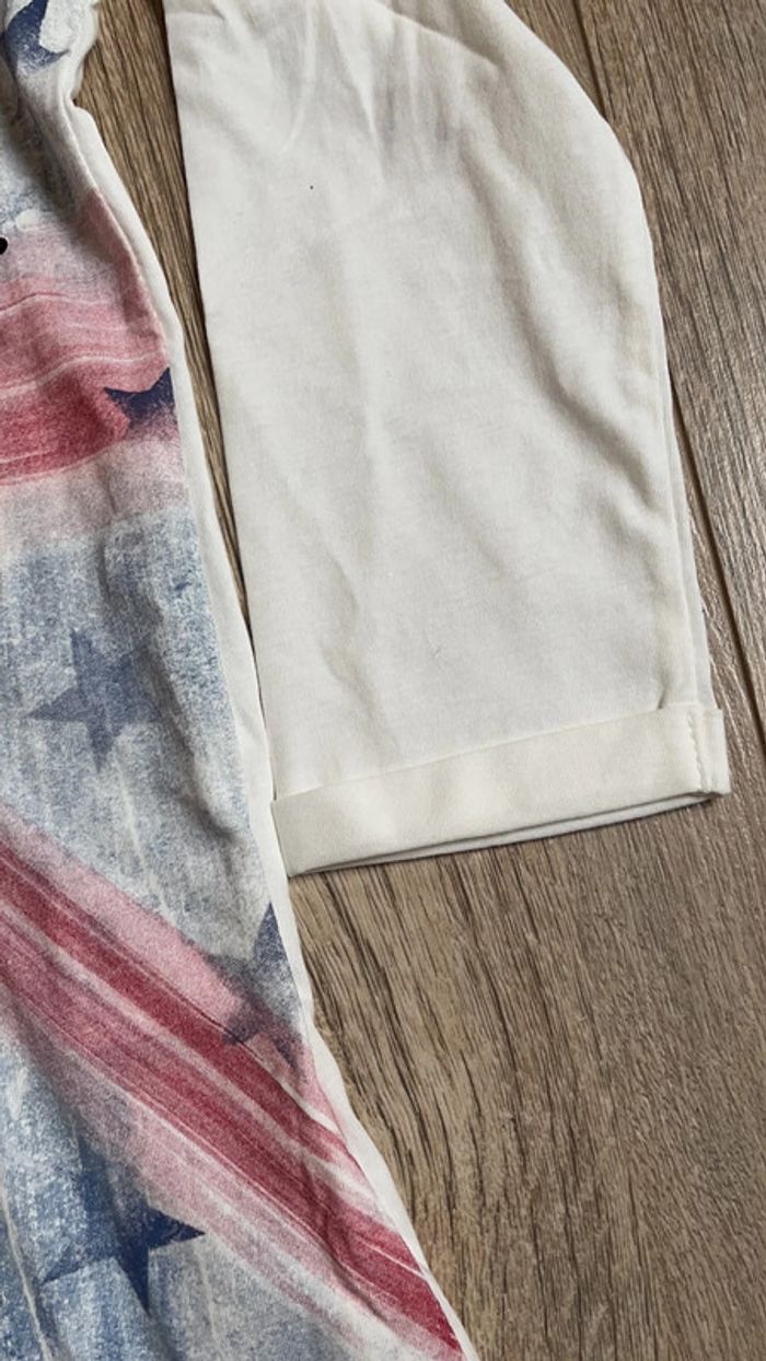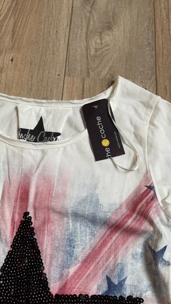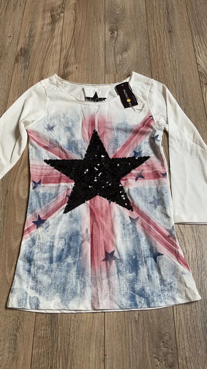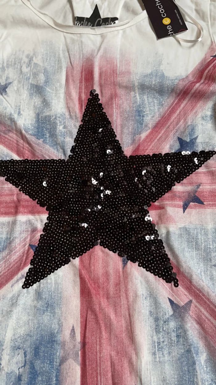 Tee-shirt à manches 3/4 écru avec motif drapeau anglais et étoile en sequins brillants Neuf avec étiquette