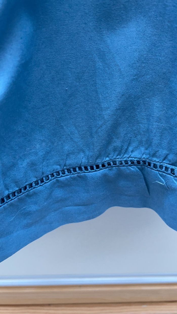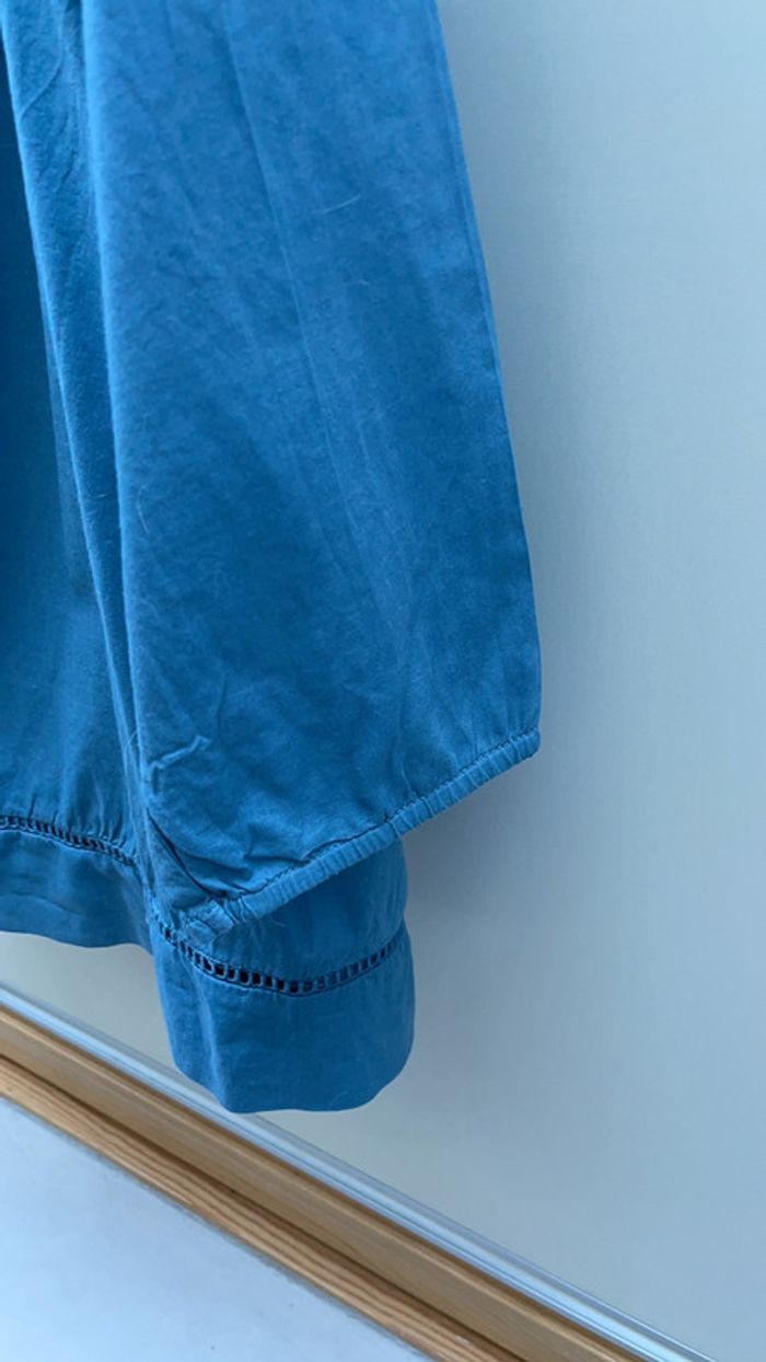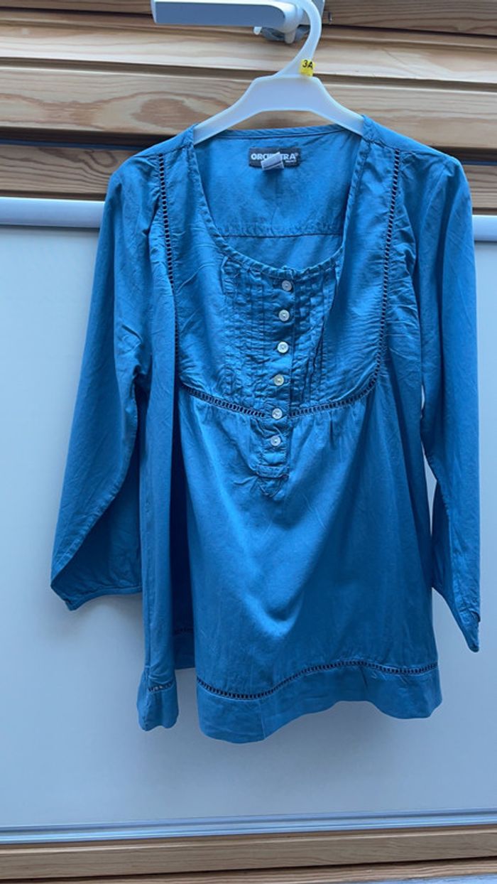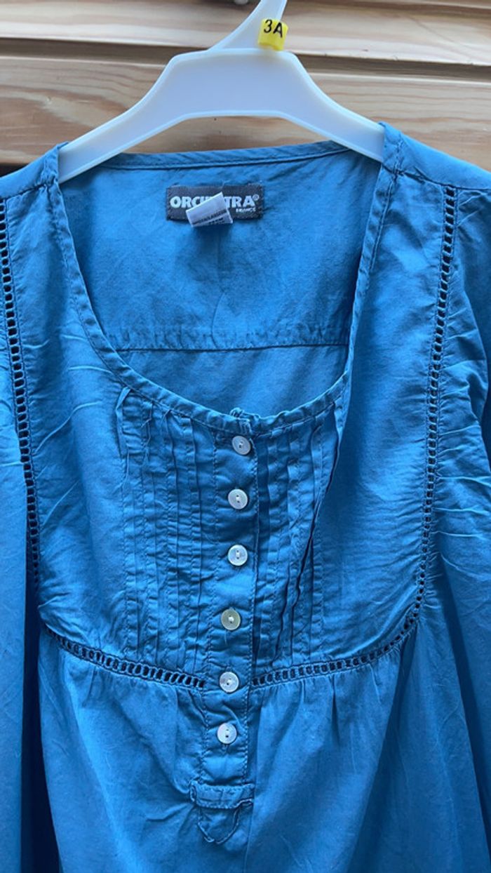 Chemise Orchestra à manches 3/4 bleu pétrole fermée à moitié par des boutons sur le devant Très jolie broderie