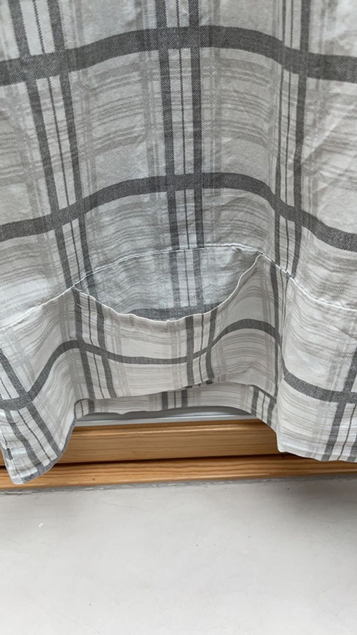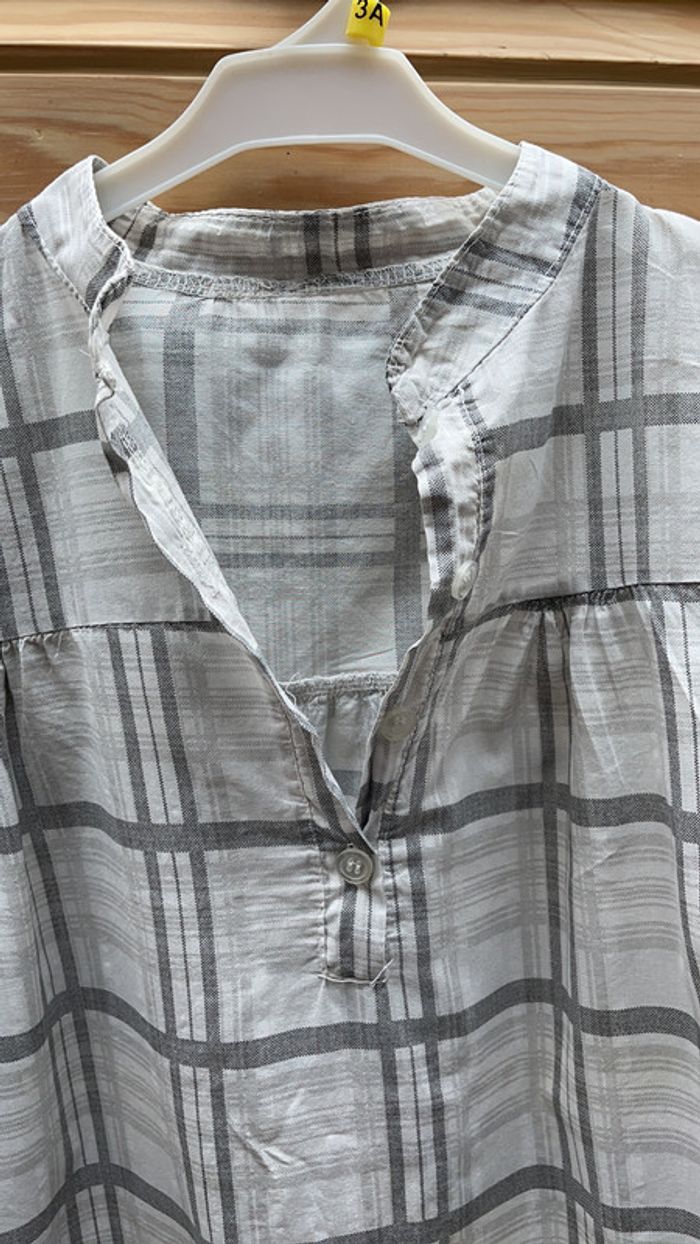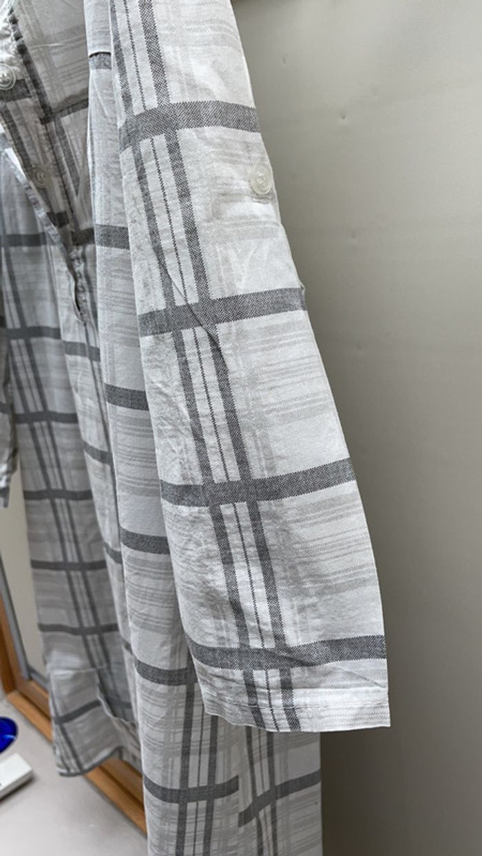 Chemise longue à carreaux blancs et gris Manches 3/4 qui peuvent se remonter en manches courtes 2 poches sur le devant insérées dans l’ourlet large en bas CN