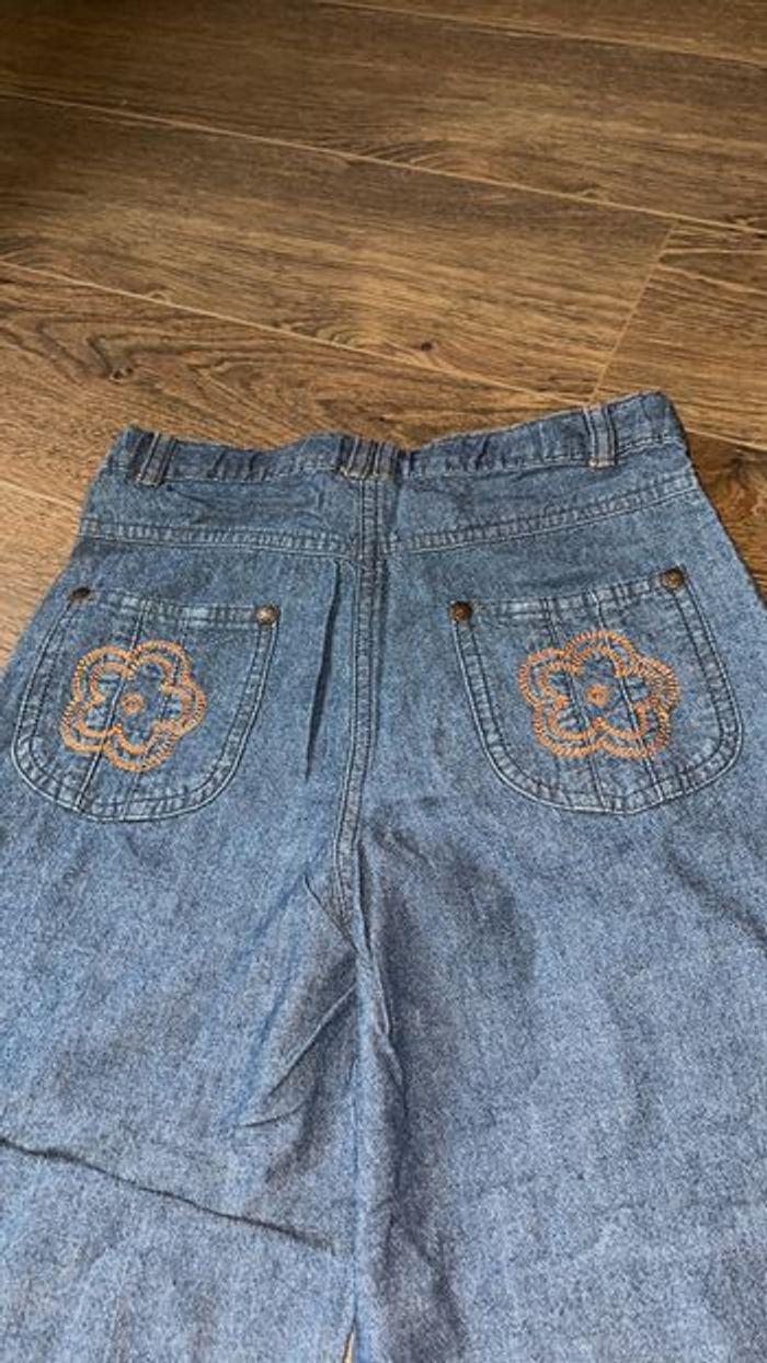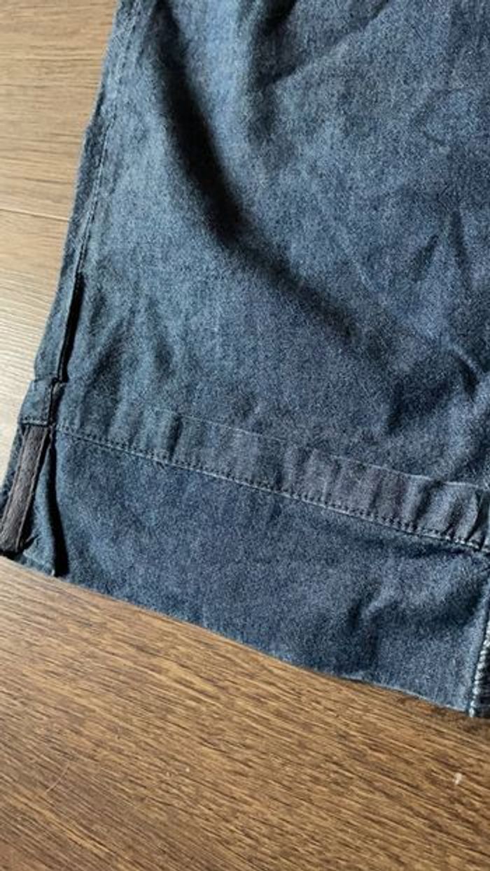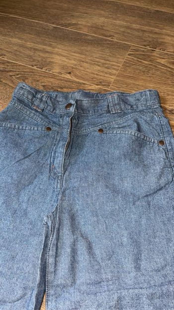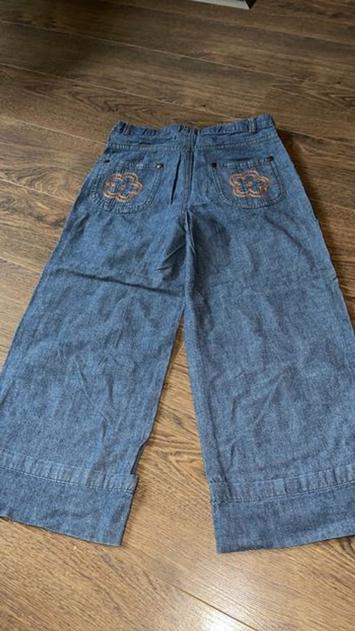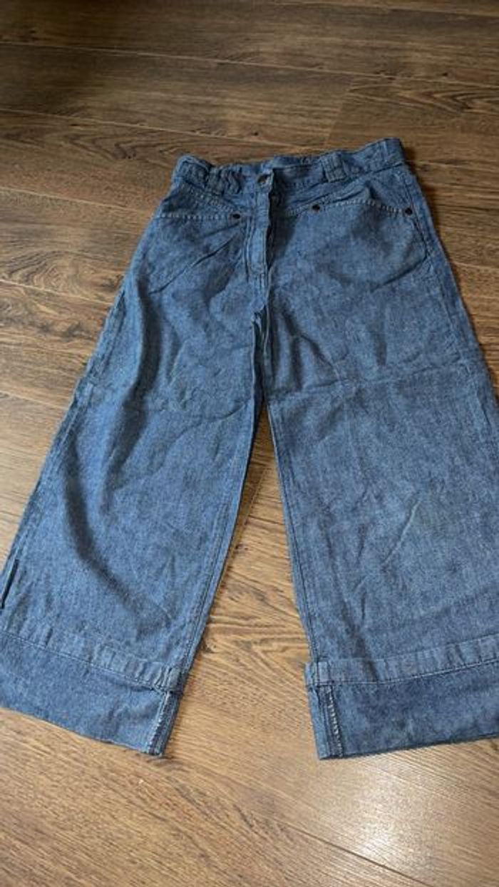 Pantalon toile couleur jean longueur 3/4 Ourlet large retourné Fermeture éclair et 2 poches devant et derrière