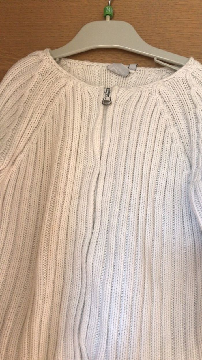Gilet en laine blanc à manches longues lavable en machine En très bon état excepté les attaches de fermeture éclair dont la « peinture » blanche est legerement parti. CLR