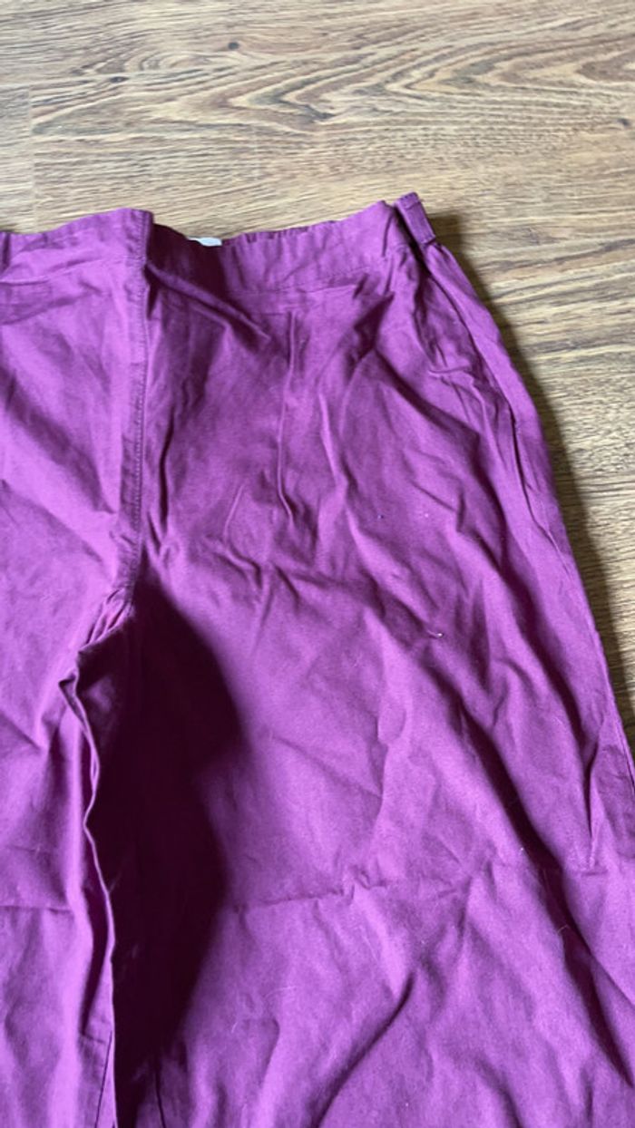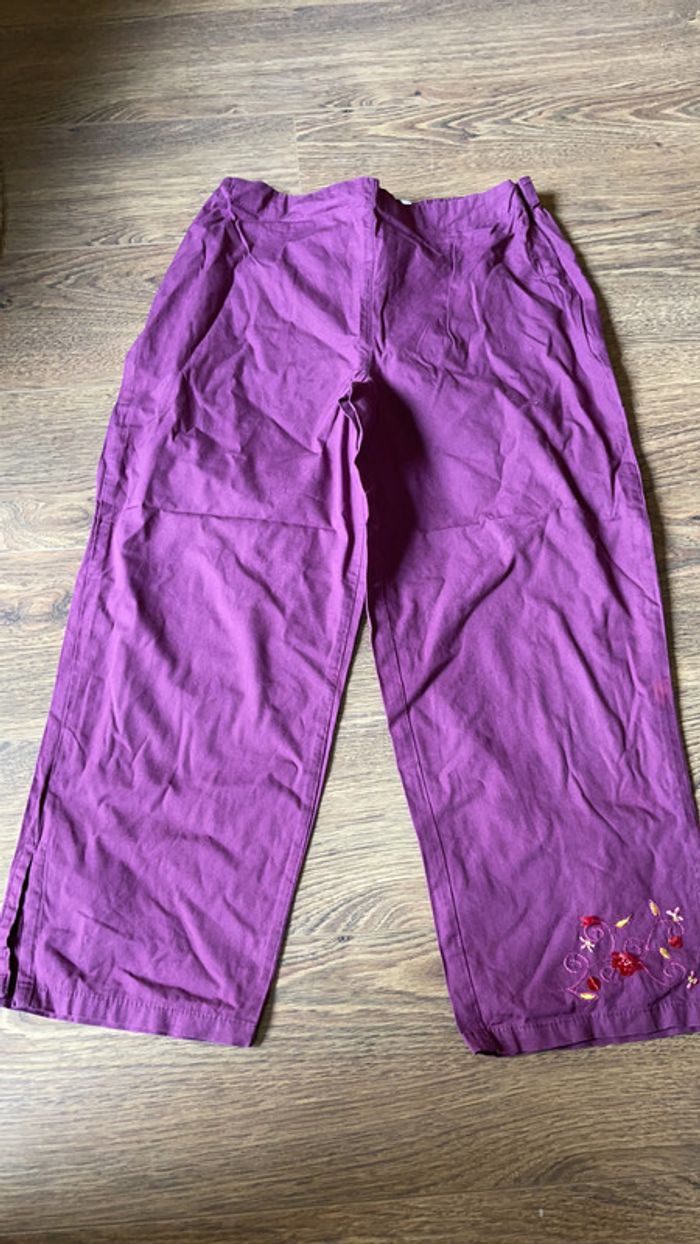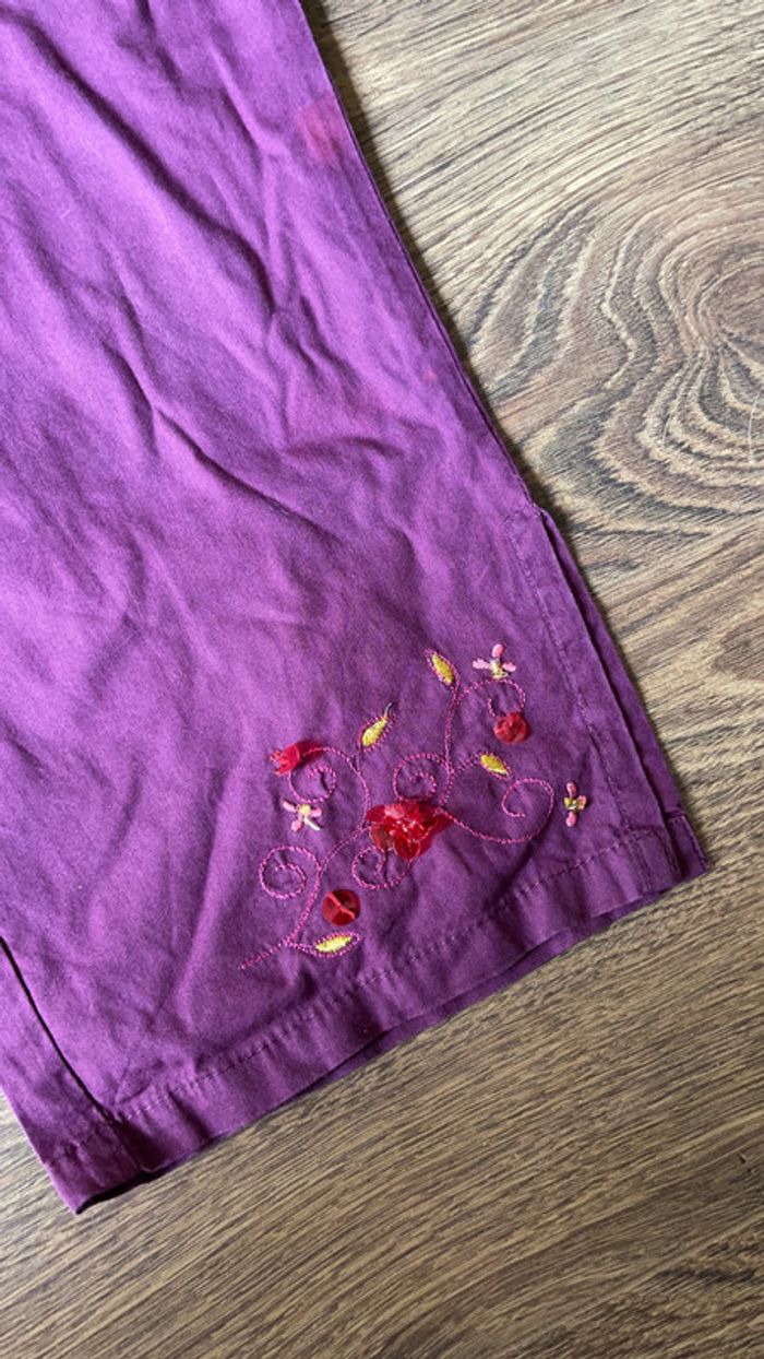 Pantalon toile coton violet 3/4 avec broderies sur le bas d’une jambe