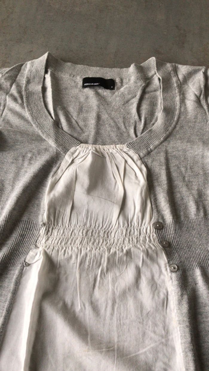 Pull gris effet superposition sur chemisier blanc à manches longues et col rond CLR