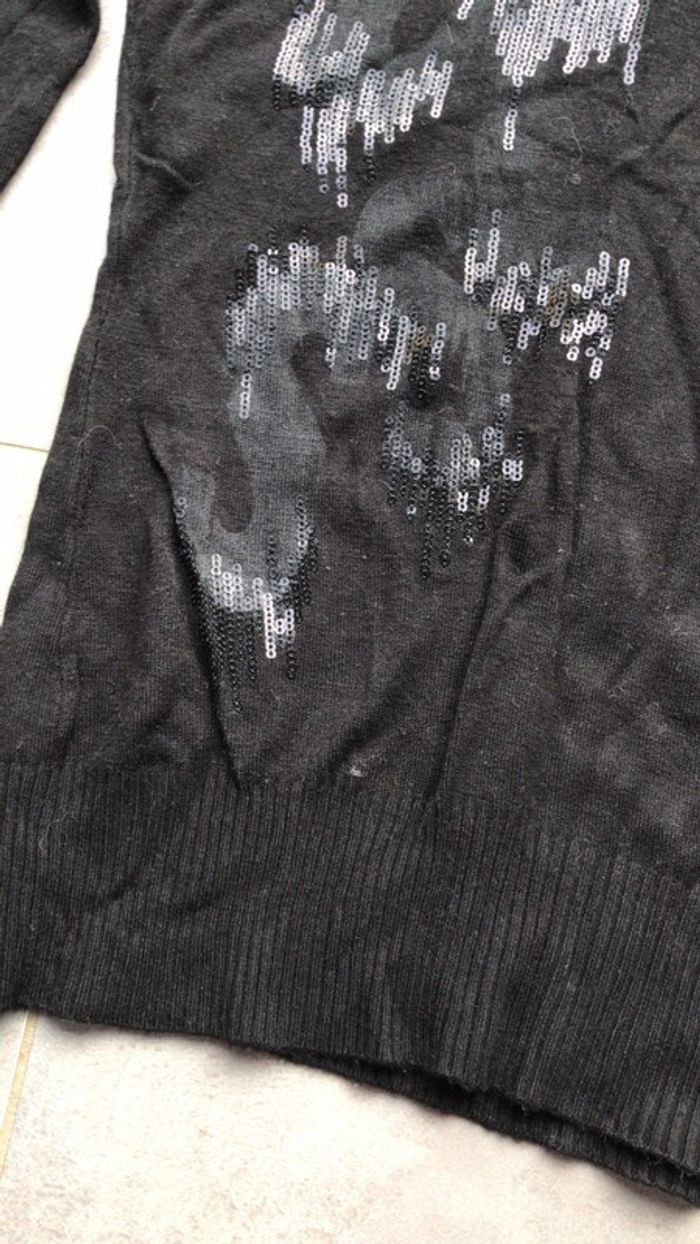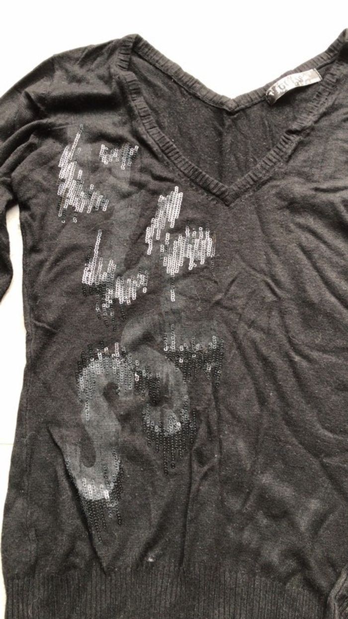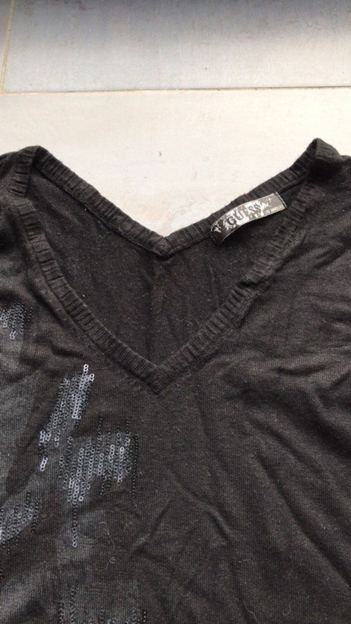Pull Guess noir avec sequins noirs brillants à manches longues et col V Attention la brillance des sequins sur la photo laisserait pense qu'ils sont gris mais ils sont également noirs.